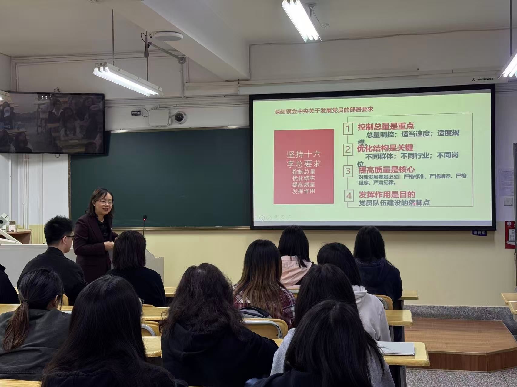 杨雯从深刻领会党中央关于发展党员的部署要求、端正入党动机、以实际行动争取早日入党、对入党积极分子的要求、党校培训期间的要求、如何撰写思想汇报等六个方面做了讲解。杨雯强调,入党积极分子要加强理论学习,提高政治素养,并把学习成果贯彻到行动中;要发挥模范带头作用 ,刻苦学习、团结同学、关心集体、乐于奉献,努力做学校“三风”建设的践行者和先行者。杨雯指出,学院在发展党员过程中,严格标准、严格培养、严格程序、严肃纪律,着力提高发展质量。把综合素质作为发展学生党员的重要考察内容,全面考察思想政治、能力素质、道德品行、现实表现等方面的具体标准,注重学生的一贯表现和关键时刻表现、自我评价和群众评议、学习情况和社会实践情况,防止把学习成绩作为考察党员的唯一条件。
