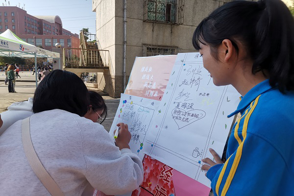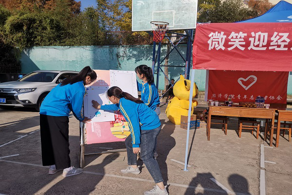 14日早上8点,志愿者们到达风雨球场,搭建志愿服务站。志愿者们搬来帐篷、桌椅、展板等物资,将帐篷搭起,挂起“微笑迎经运,志愿献和谐”的条幅,摆好贴有海报和签名墙的展板,齐心协力搭建好爱心志愿服务站。服务站里摆放着面包、红牛、水、士力架等物资,小小的服务站也是运动员的能量供给站,为经济健儿们保驾护航。引导前来比赛的同学,志愿者的身影穿梭在运动会的每一个角落,等比赛结束后清理场地卫生......奉献、付出,志愿者们就这样用自己的行动传递着志愿者精神。此外,志愿者们还精心设计了可爱的签名墙,带来皮卡丘等,让紧张的运动会也多了一丝愉快的氛围。