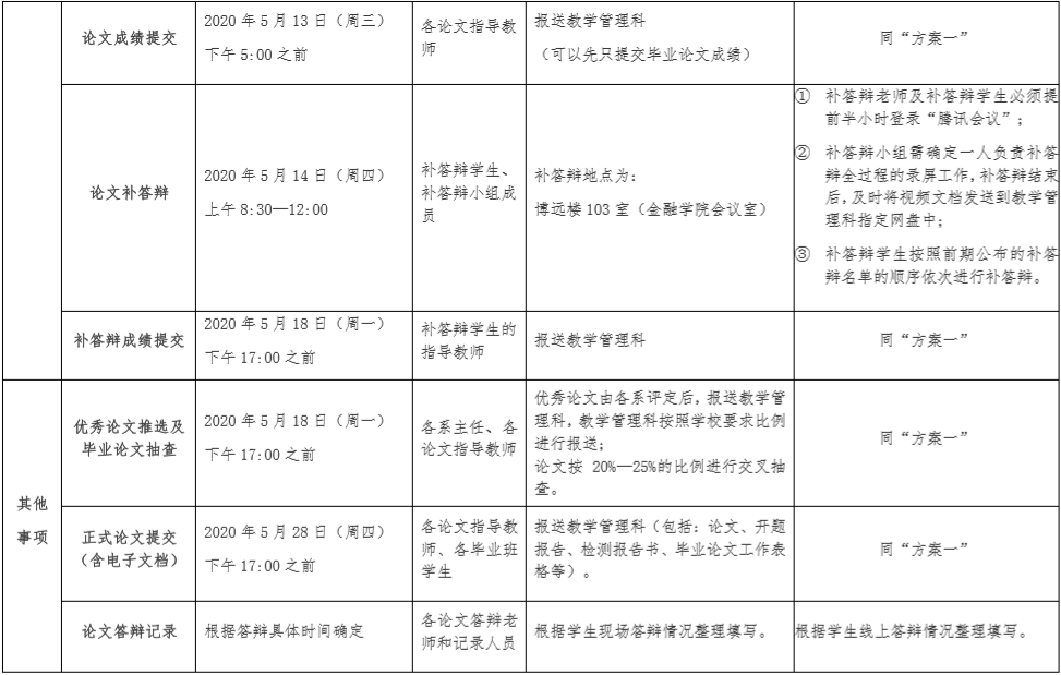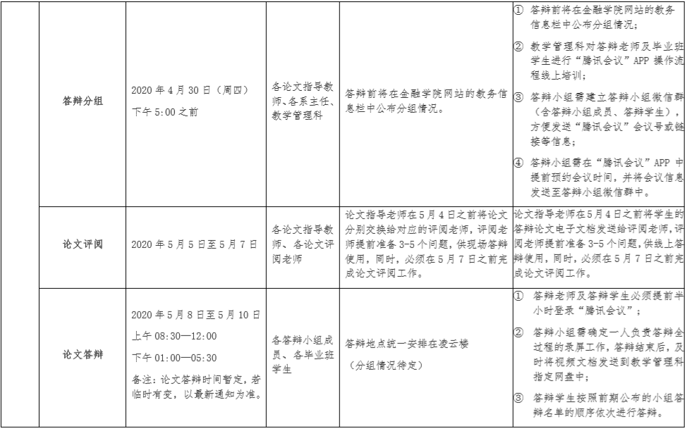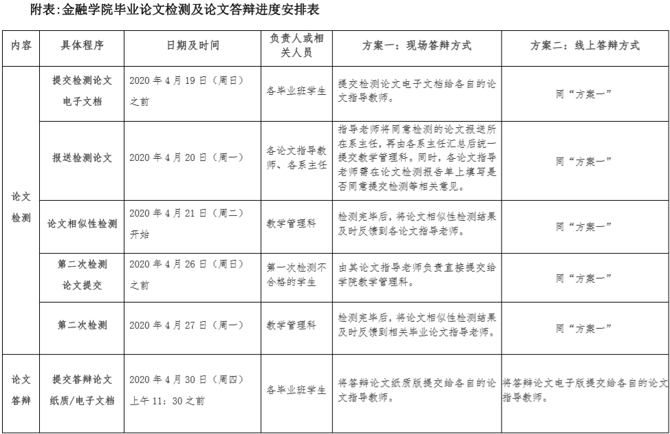 结合我院实际情况,鉴于金融学院本届参加毕业论文答辩人数较多(393人),并考虑到疫情防控期间学生返校时间的不确定性,以及在学生如果不能如期返校的情况下所采取预案既要满足学校的相关规定和要求,还要具有一定的可操作性等多方面因素,学院为此制定了2020届本科毕业论文答辩的两套方案,即如果学生能够在确定的论文答辩时间之前如期返校的情况下则采取方案一:现场答辩方式;如果在学院确定的答辩时间前学生不能返校的情况下则采取方案二:线上答辩方式,即学院拟采用“腾讯会议”线上直播平台进行线上答辩,近期学院将对答辩老师和毕业班学生全方位推进具体针对“腾讯会议”平台的使用操作等相关内容的培训工作。有关2020届本科毕业生毕业论文的检测及论文答辩的时间进度安排,以及操作流程和具体要求等相关内容详见附表:《金融学院毕业论文检测及论文答辩进度安排表》。
