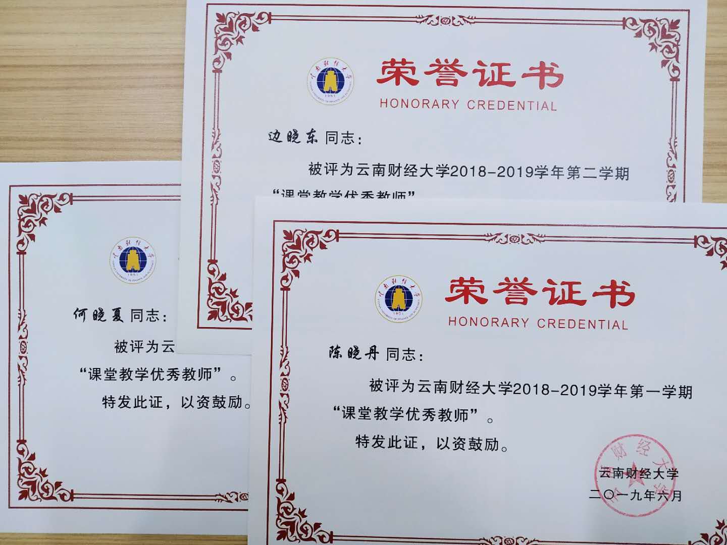 在学校组织的2018—2019学年期中教学质量检查中,我院陈晓丹、梁隆斌、陈永忠、杨慧、黄儒靖五位老师被评为“2018—2019学年第一学期课堂教学优秀教师”,陈永忠、梁隆斌、边小东、张伟、何晓夏五位老师被评为“2018—2019学年第二学期课堂教学优秀教师”。