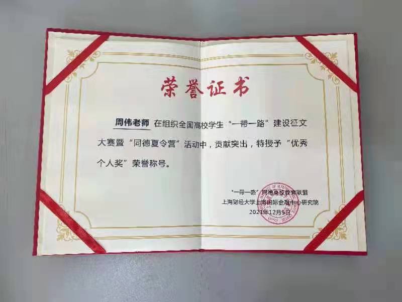 据悉我院共有48名同学的论文符合2021年(第七届)“一带一路”建设全国高校学生征文要求,经组委会组织专家初审,初评和复评后获得研究生组优秀论文一等奖1项,三等奖1项,优秀奖4项,学院连续三年获得最佳组织奖,学院副院长周伟教授获优秀个人奖。