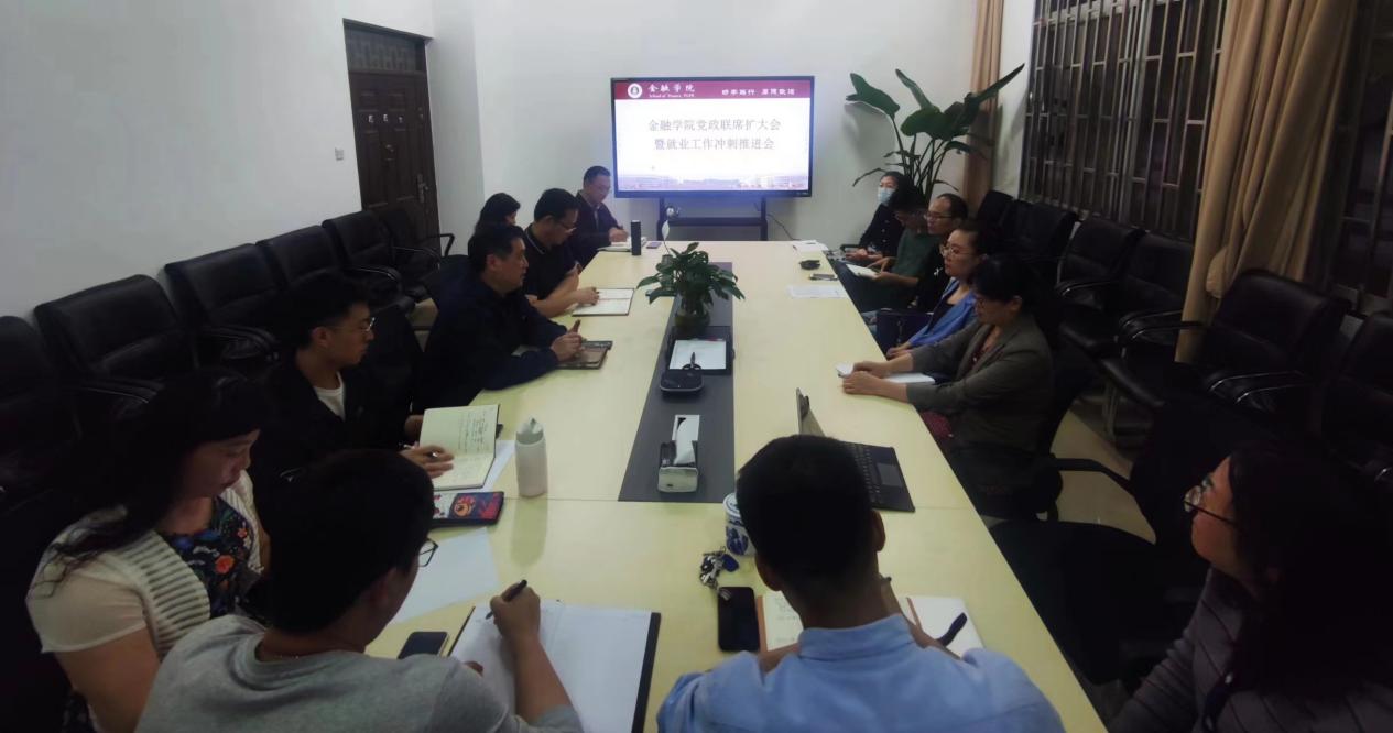 金融学院于2022年6月18日晚上在博远楼115会议室召开金融学院党政联席扩大会暨毕业生去向落实工作冲刺推进会。学院全体中层干部、系主任和毕业班班主任参加会议。