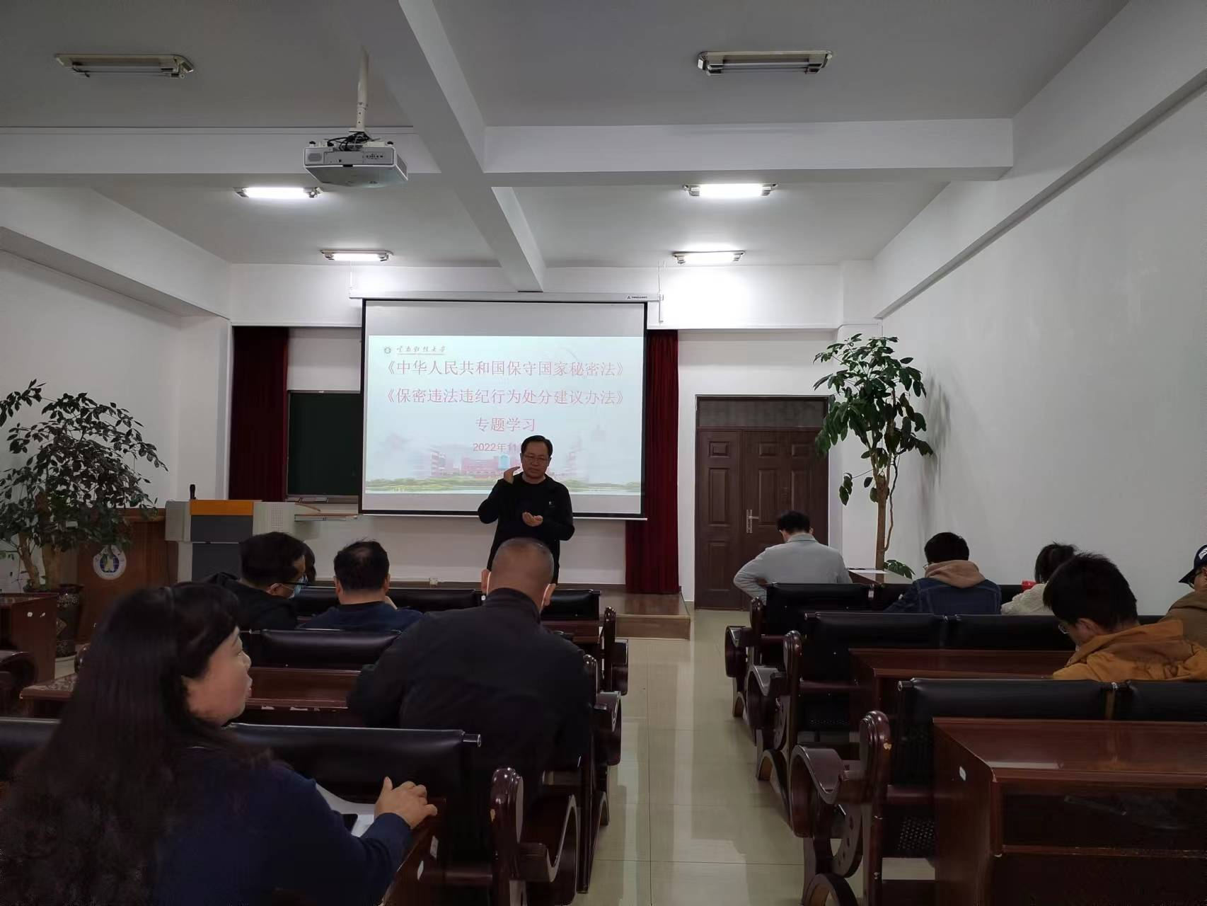 11月4日中午,学院在博远楼103以《中华人民共和国保守国家秘密法》、《保密违法违纪行为处分建议办法》为主要内容开展理论学习。此次学习由院长周伟主持,党委书记李德清领学。学院教职工学习后展开了讨论发言。