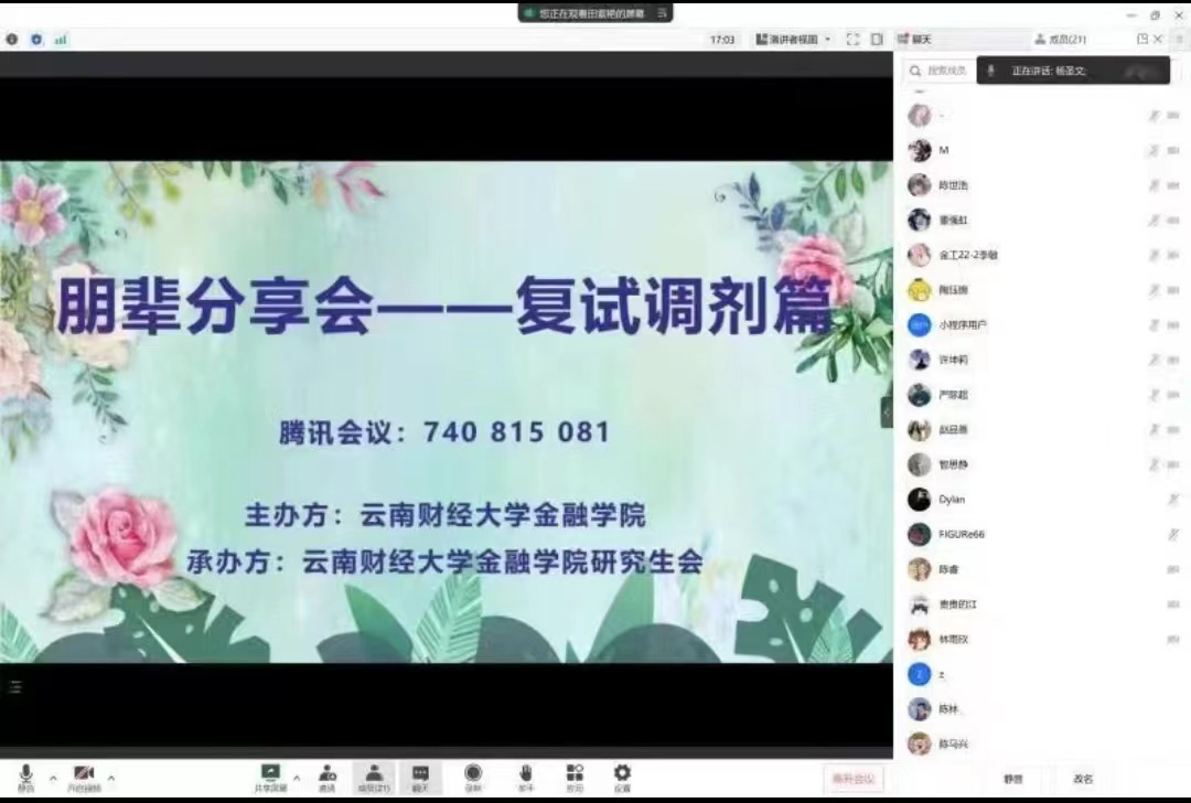 为进一步增加考研同学对金融学院复试流程及内容的认识,金融学院于3月10日下午2:30在博远楼103室举办了考研复试调剂分享会。学院邀请了2022级研究生作为本次分享会的主讲人与同学们进行交流,此次分享会由陈马兴同学主持,分享会通过线上和线下两种方式开展。