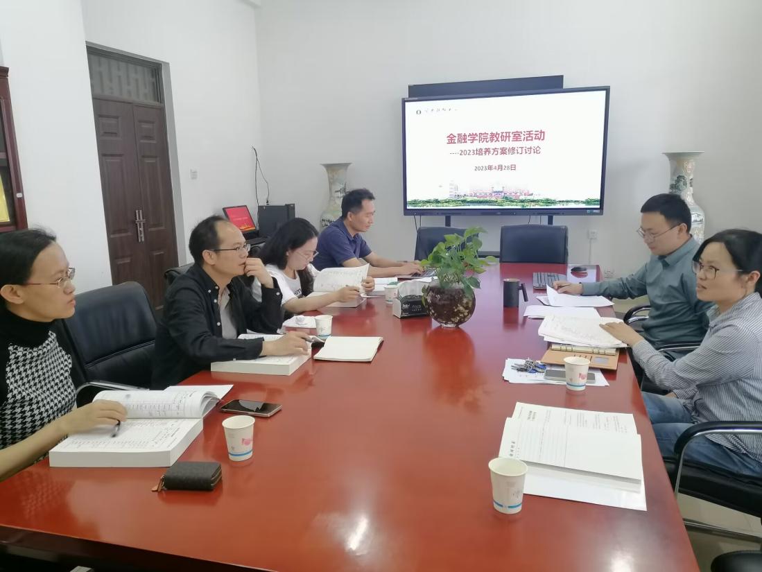 2023年4月28日下午,金融学院在学院111会议室召开了本科人才培养方案研讨会。会议由杨国辉副院长主持,李江城副院长,金融系系主任马彧菲老师,金融工程系系主任陈晓丹老师,副系主任赖付军老师,保险系系主任李云仙老师,学院教务科苏芮老师参加了本次会议。会议就如何制定金融学院2023级人才培养方案进行了讨论,提出本次培养方案制定首先要符合《普通高等学校本科专业类教学质量国家标准》,充分考虑我院学生的实际学习情况,升学情况和职业发展情况,结合我院对标院校,对目前的课程、课时、开课时间进行调整,合理规划,力求做到与时俱进,科学培养人才。