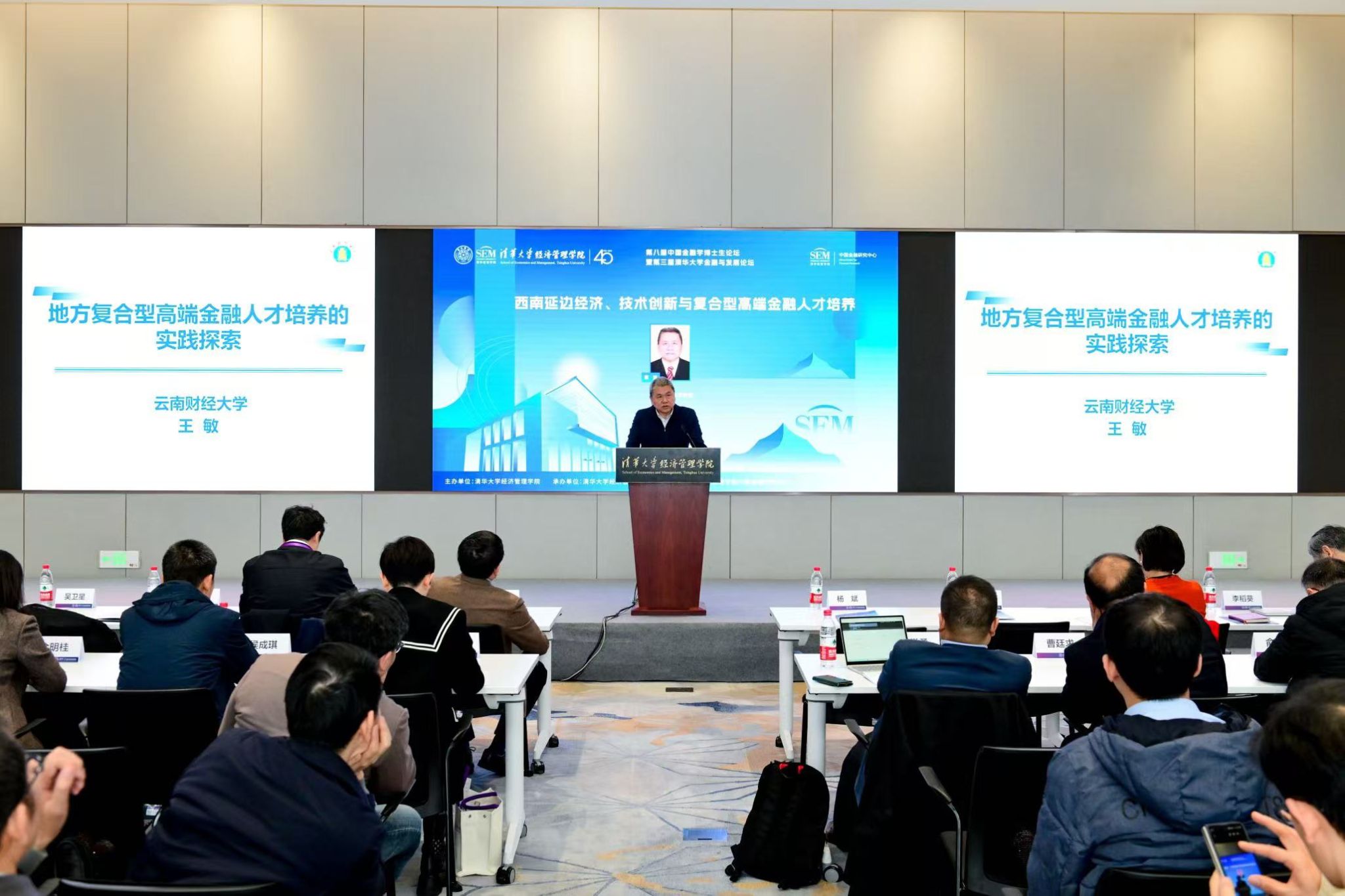 王敏在主题发言中立足学校服务云南省融入国家战略和推动地方经济高质量发展,着重从人才培养的定位、特色和创新三个方面,系统介绍了学校以博士生培养为代表的区域性高端金融人才培养实践。在培养定位方面,学校立足于匹配行业、匹配地方和匹配时代的三个维度,凝练形成了普惠金融、跨境金融、绿色金融、金融工程和金融科技五个方向。在培养特色方面,建立了赋能人才培养的三大平台:一是“金融+经济+科技”的科技创新平台,开展金融经济协同研究,突出与省级工程中心、重点实验室和云南省跨境贸易与金融区块链研发中心联合研发,实现金融与科技的产品化深度融合创新;二是“金融+国际化+区域化”的国际化平台,在建立全球视野的过程中,着重突出面向南亚东南亚的开放培养特色;三是“高校+政府+企业”的实践研究平台,通过校政企联合平台,从实践一线选题、前沿理论支撑、现代方法应用和实现成果转化等四个方面开展高质量的金融研究。在创新培养方面,学校积极探索融入云南省面向南亚东南亚辐射中心建设新模式,不断开拓面向南亚东南亚的金融经济研究新空间。通过三个方面的举措,形成了立足地方经济发展、突出金融与科技交叉创新、具有鲜明区域国际化特色的高端金融人才培养实践。