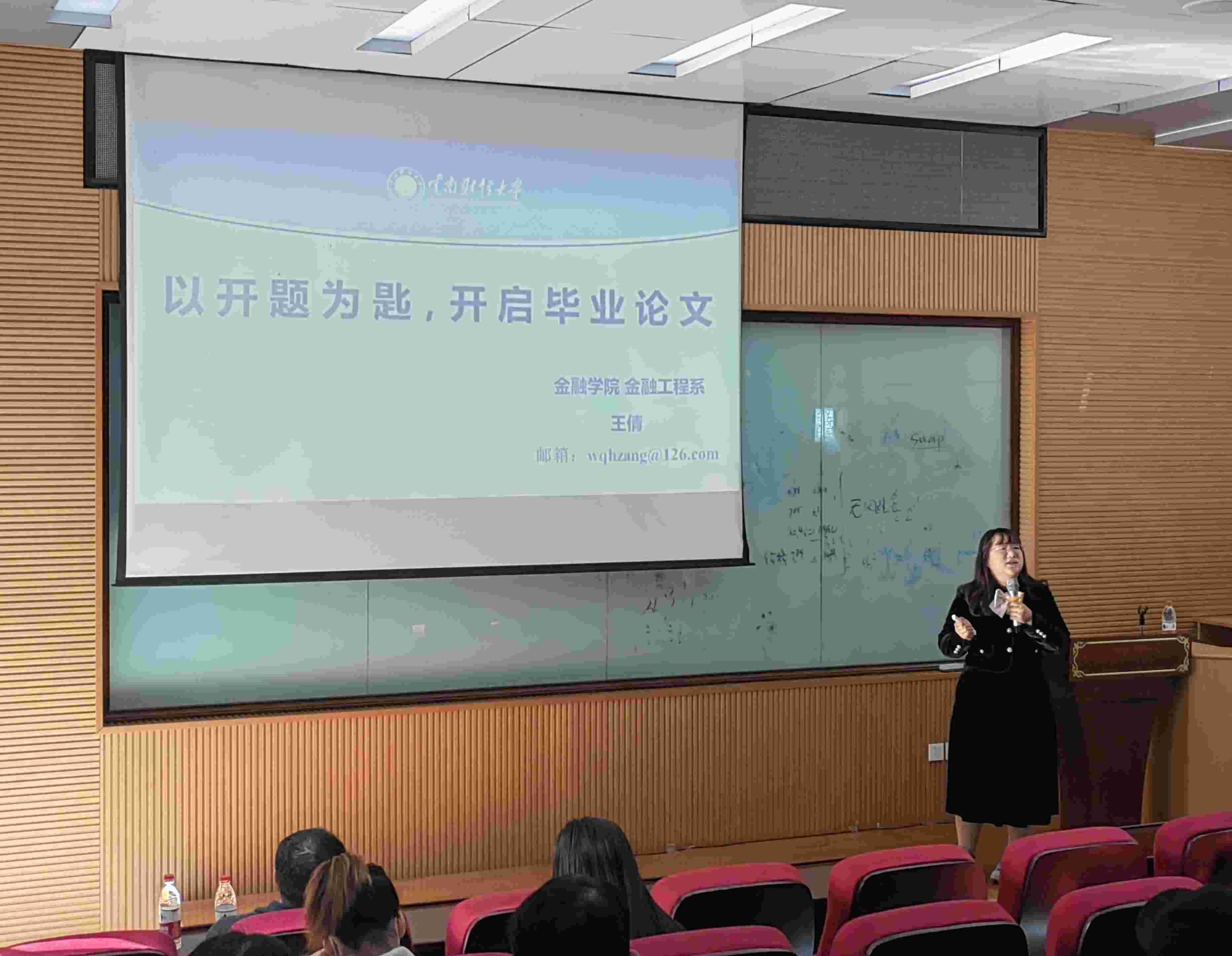在“青年教师学术交流”阶段,王倩博士以 “以开题为匙,开启毕业论文”为题做专题讲座。王倩分别从“是何物”、“如何写”、“若何报”、“奈何想”四个方面详细为同学们阐述了什么是开题报告、如何写开题报告、怎样制作开题答辩PPT以及如何进行开题汇报等问题,让大家对开题报告的撰写有了深入的认识。