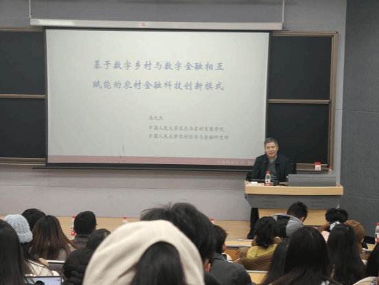 2026年1月9日上午,中国人民大学农业与农村发展学院马九杰教授应金融学院邀请在行远楼D301报告厅以“数字乡村与数字金融相互赋能的农村金融科技创新模式”为题作学术讲座,讲座由金融学院黄倩教授主持。