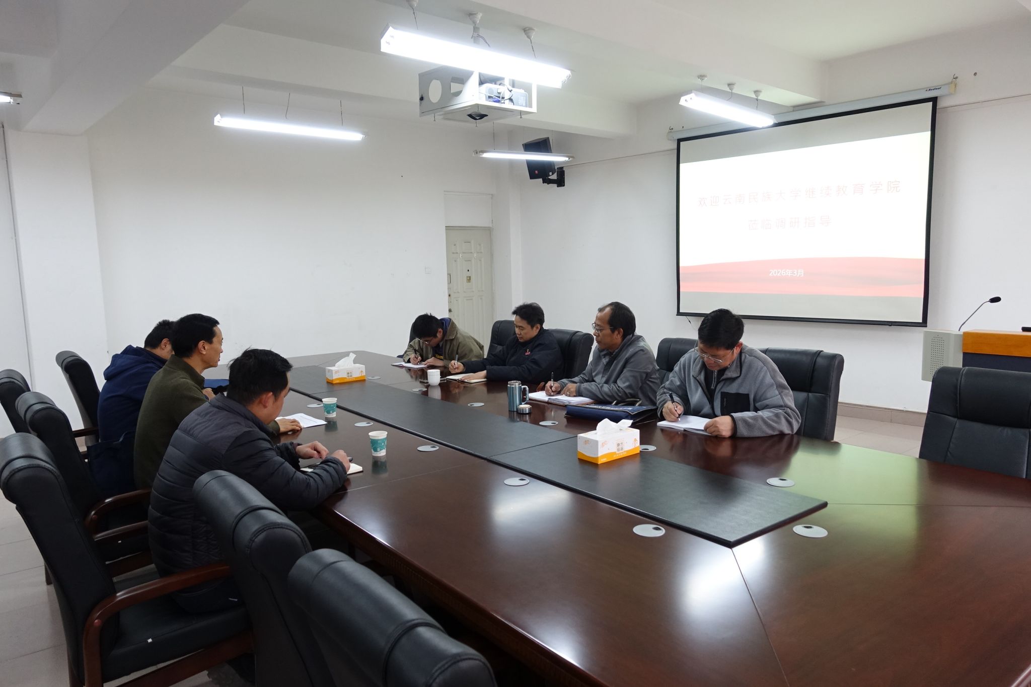 3月12日上午,云南民族大学继续教育学院党支部副书记杨志远一行3人到访继续教育学院,与学院院长胡服、副院长林明辉、办公室主任刘继发在学院403会议室开展座谈。双方围绕非脱产高等学历继续教育招生、党建引领、创收分配及绩效工资发放等方面开展了深入交流。
