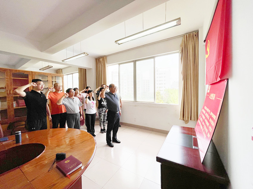 金国兴带领全体党员向党旗庄严宣誓。党员同志们面对鲜红的党旗,重温入党誓词,铿锵而豪迈的声音表达了“不忘初心、牢记使命”的坚定信念。全体党员表示,要时刻牢记入党誓词,不忘初心,加强党史学习,强化党员角色意识,积极发挥党员先锋模范带头作用,以实际行动履行自己的庄严誓言。