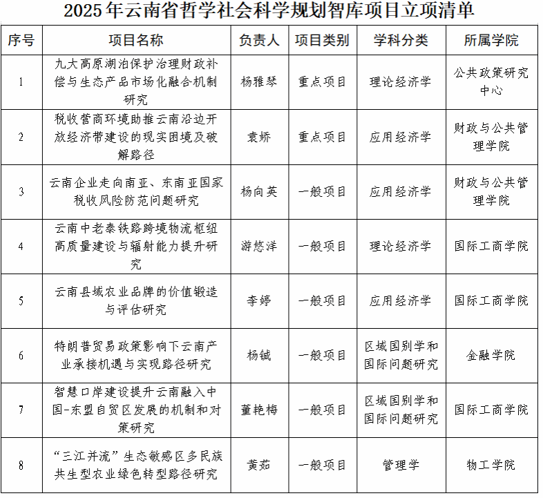 近日,云南省哲学社会科学工作办公室公布了2025年云南省哲学社会科学规划智库项目立项名单,bat365官网表现卓越,共有 8个项目拟获批立项,其中重点项目2项、一般项目6项。立项总数不仅创造了bat365官网在该类项目上的历史最好成绩,更是位居全省高校榜首,这一成果充分彰显了bat365官网在智库研究领域的雄厚实力。