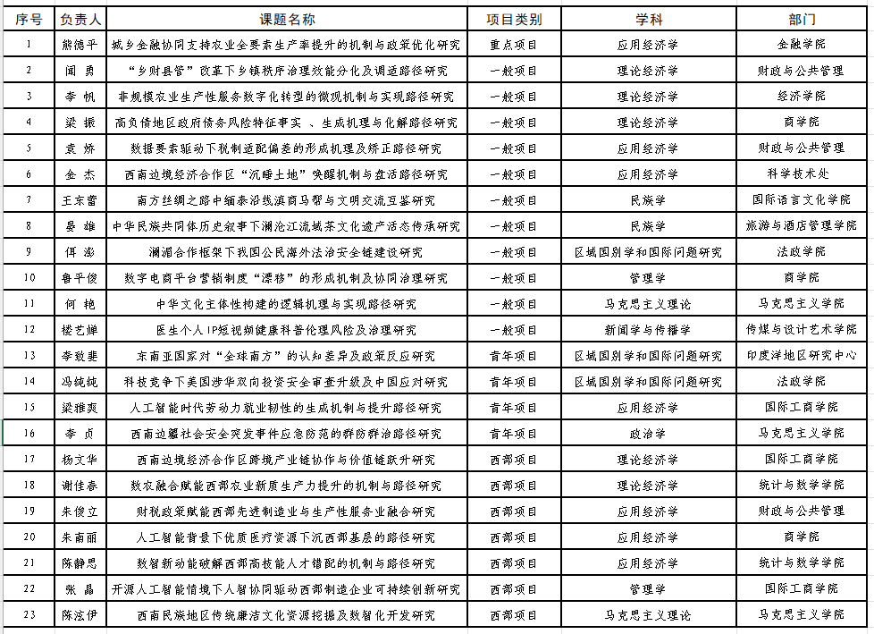 近日,全国哲学社会科学工作办公室公示了2025年国家社会科学基金年度项目拟立项名单,bat365官网拟立项23项,其中重点项目1项,一般项目11项,青年项目4项,西部项目7项,拟立项数在全国排名69位、云南省排名第二,平均拟立项率23%,拟立项数和拟立项率均创bat365官网历史最好成绩。