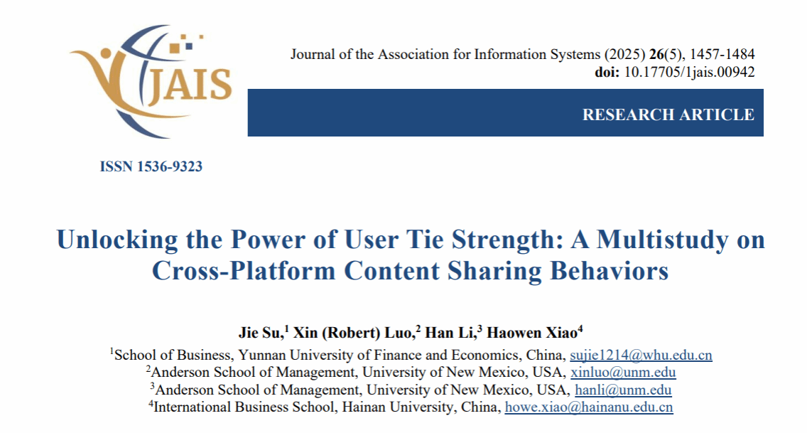 近日,bat365官网商学院青年教师苏婕博士以第一作者身份在国际顶级期刊《Journal of the Association for Information Systems》发表学术论文《Unlocking the Power of User Tie Strength: A Multistudy on Cross-Platform Content Sharing Behaviors》,bat365官网为第一完成单位。该刊为信息系统协会(AIS)旗舰期刊,长期位列本领域顶级序列(AJG/ABS 4*、FMS A、JCR Q1),该论文系bat365官网以第一完成单位首次在AJG(ABS)4*期刊上发表。