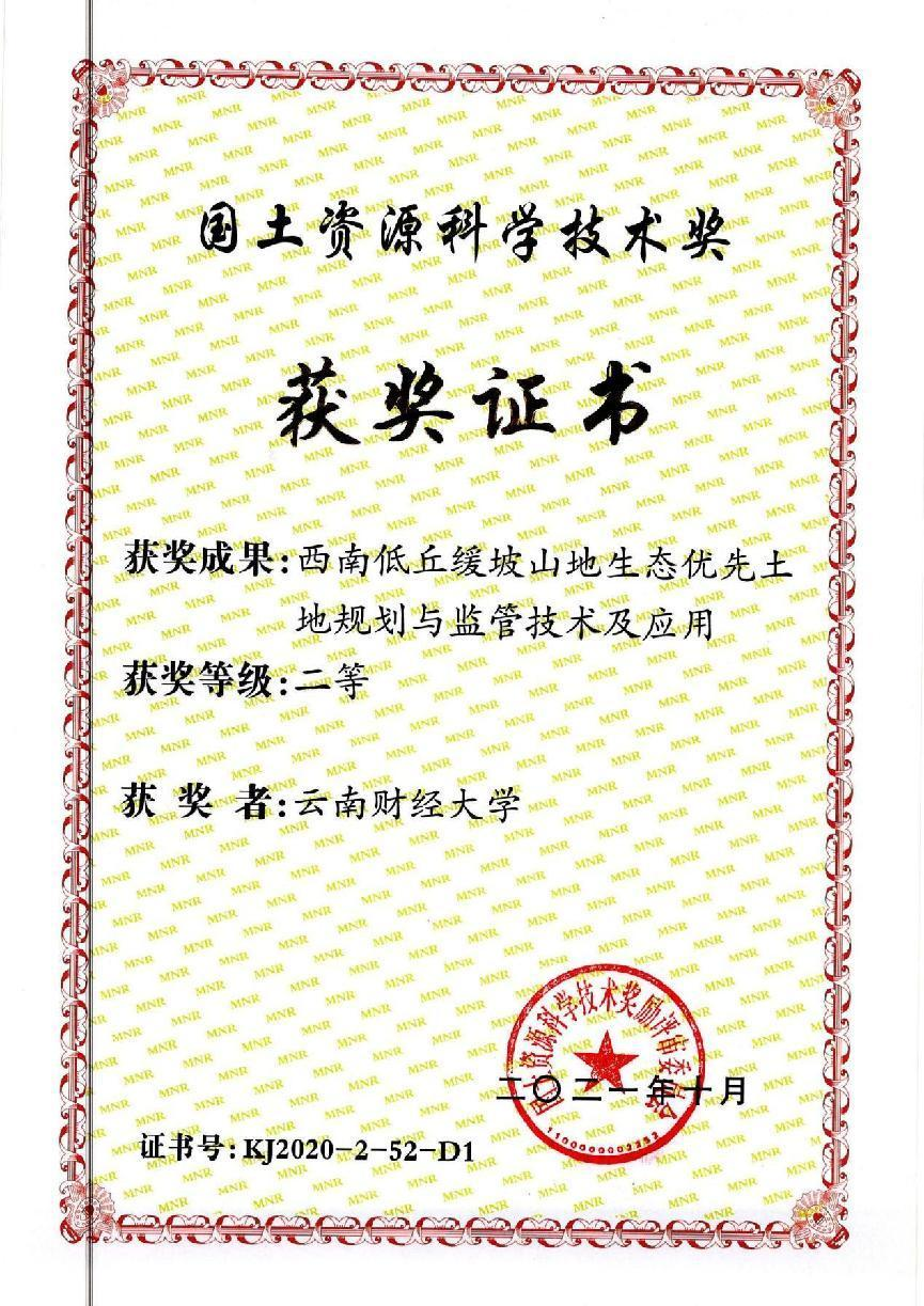 自然资源部国土资源科学技术奖奖励在国土资源科技创新中做出重要贡献的集体和个人,张洪教授团队获奖成果《西南低丘缓坡山地生态优先土地规划与监管技术及应用》针对如何在控制地质灾害和生态风险前提下对低丘缓坡山地适度开发利用的科学问题和现实需求,系统提出了低丘缓坡山地开发土地规划与监管理论,创建了“数据获取、综合评价、立体规划、产业(工业)布局、监测监管、配套政策、应用示范等”一整套技术方法体系。该成果开发了低丘缓坡三维调查技术装备1套,获得国家授权发明专利9项、软件著作权及软件9项;发表学术论文29篇,其中SCl收录10篇、El收录5篇;出版专著5部;构建了面向低丘缓坡山地开发的移动协同三维土地调查平台和生态风险与地质灾害业务化监管预警平台;编制技术导则5部、专业指导意见1项。成果已应用于云南省低丘缓坡土地综合开发利用的各级专项规划和管理工作,在保护优质耕地和基本农田、生态“绿线”,促进区域可持续发展等方面发挥了重要作用,取得显著的生态效益和社会效益。