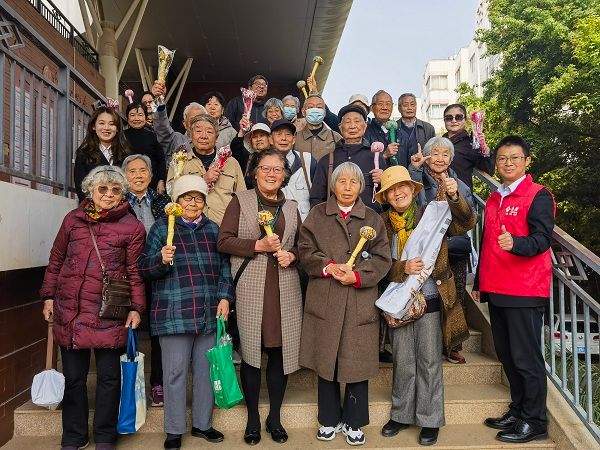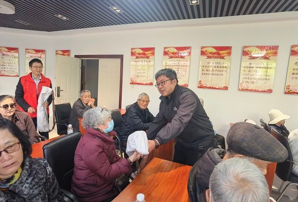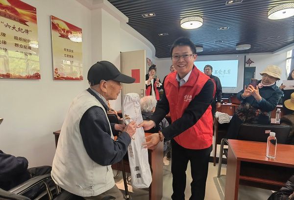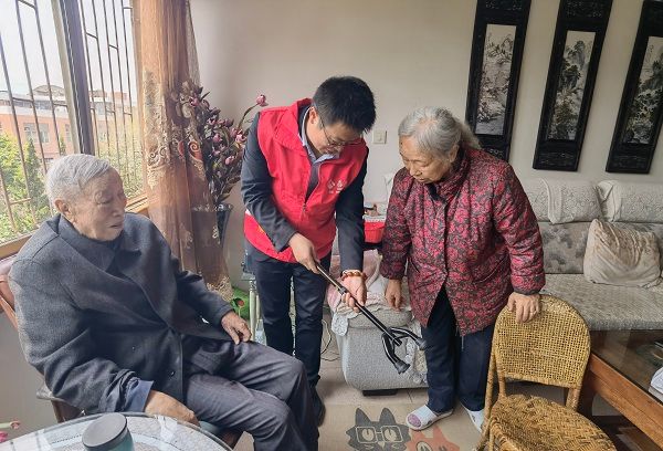 志愿者们一起为现场的老同志发放了20余根多功能拐杖,并上门