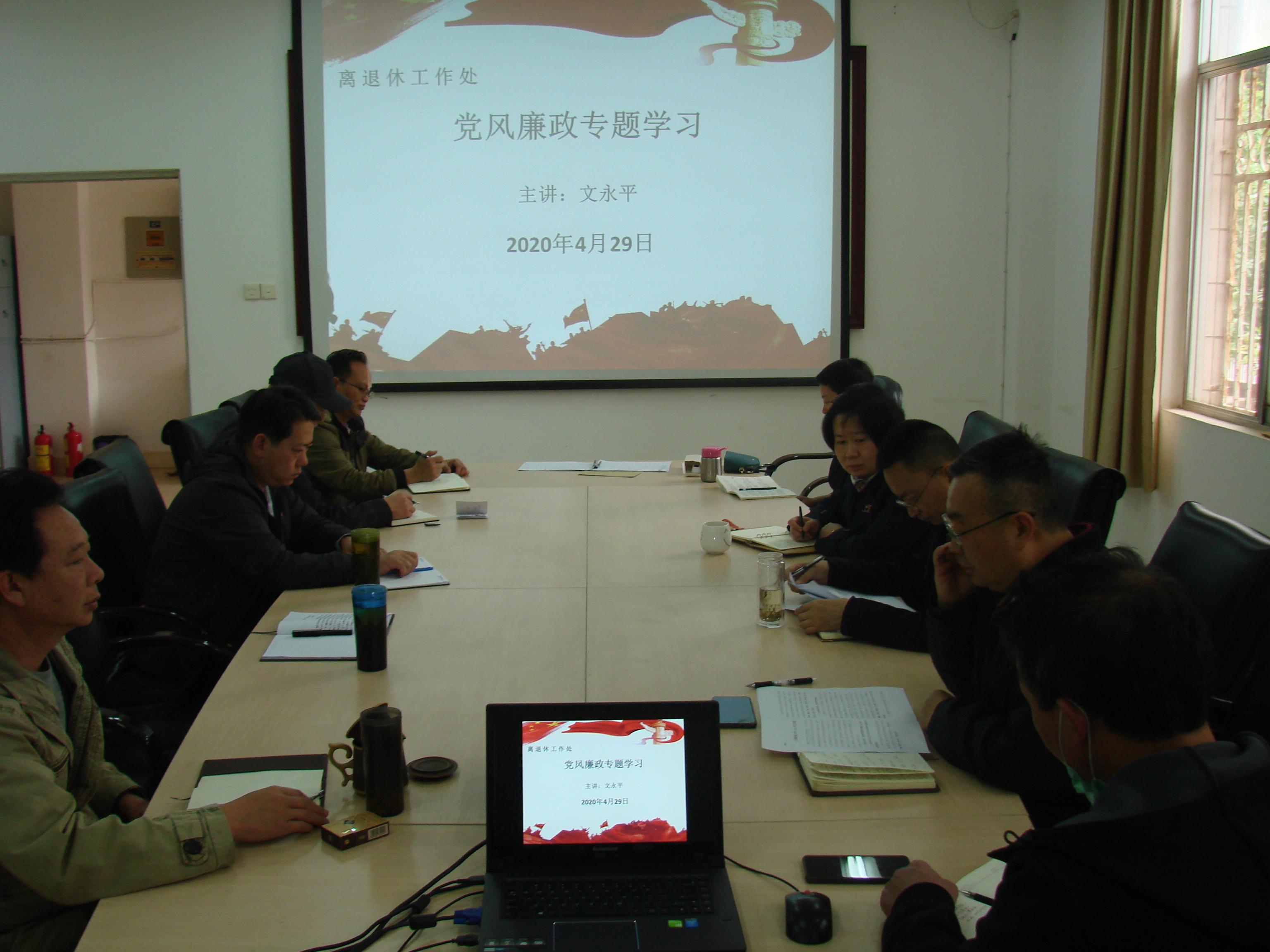 4月29日下午,离退休处开展党风廉政建设专题学习,学习由处党委书记唐永昆主持,全体教职工参加。