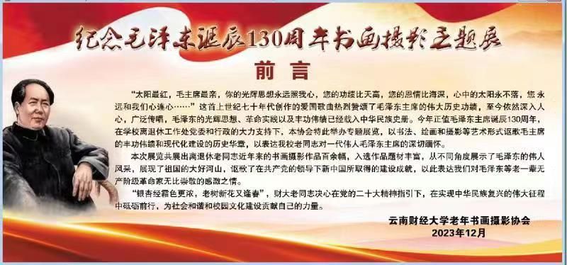 2023年12月25日,学校离退休工作处和老年书画摄影协会在学校职工活动中心共同举办“纪念毛泽东同志诞辰130周年书画摄影主题展”,离退休处处长高天云、处党委副书记兼纪委书记王俊、老年书画摄影协会会长童映河、副会长李延萍、委员孙军、姚元吉等出席仪式。学校部分离退休老同志及离退休处全体在职职工参加仪式。