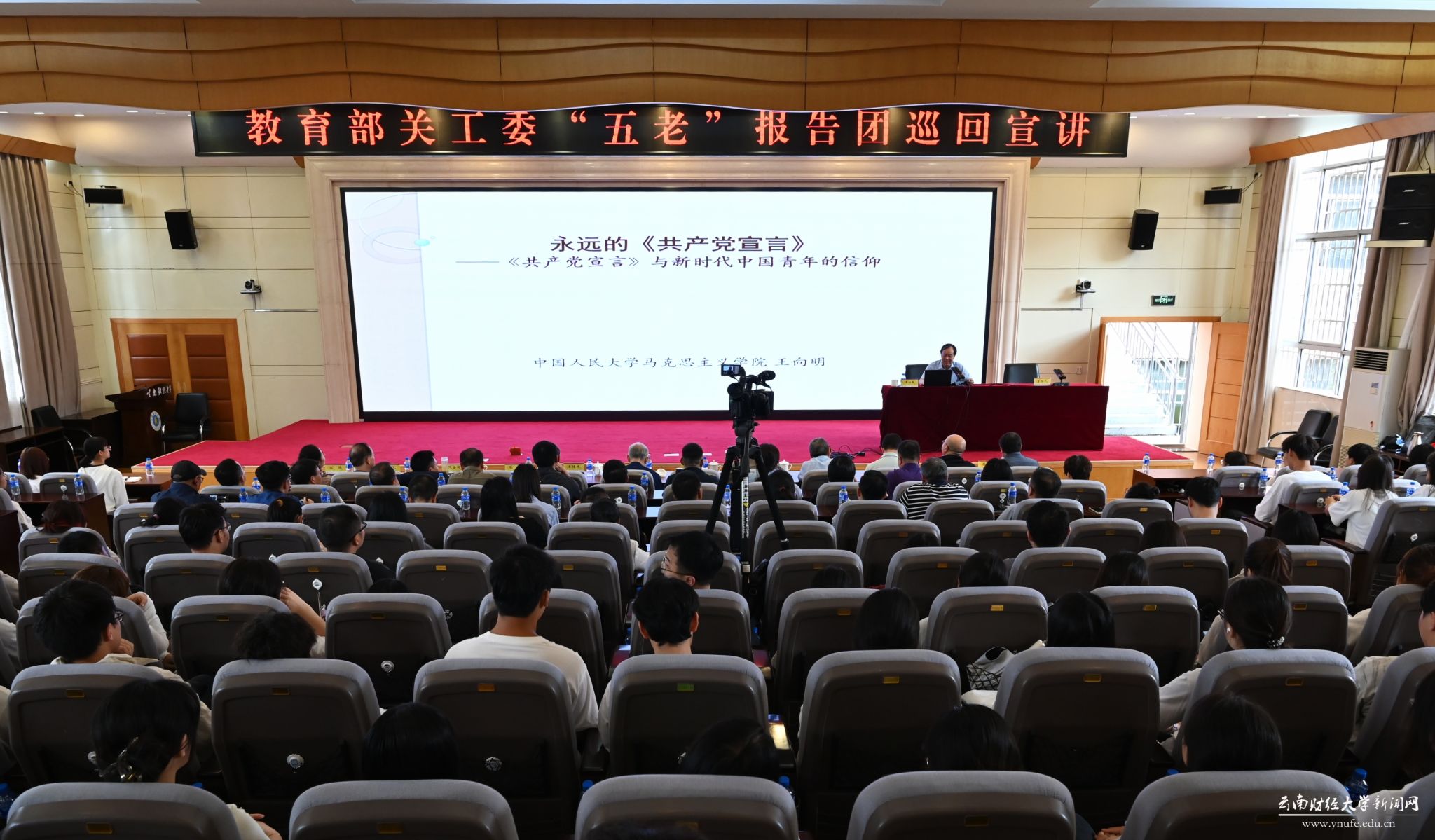 为秉承和发扬关工委“五老”忠诚敬业、关爱后代、务实创新、无私奉献的精神,助力青年学子成长成才,在教育部及云南省教育厅关工委的精心指导下,9月12日下午,教育部关工委“五老”报告团专家——中国人民大学马克思主义学院王向明教授莅临bat365官网国际学术报告厅,以《‘共产党宣言’与当代中国青年的信仰》为题,为bat365官网师生讲授了一场精彩的思想政治理论课。宣讲会由bat365官网党委委员、副校长颜明主持,云南省教育厅关工委“五老”报告团成员、学校党委委员、宣传部部长寸丽锋、学校关工委成员单位主要负责人、马克思主义学院思政课教师代表、辅导员及学生代表共计300余人参加宣讲会。