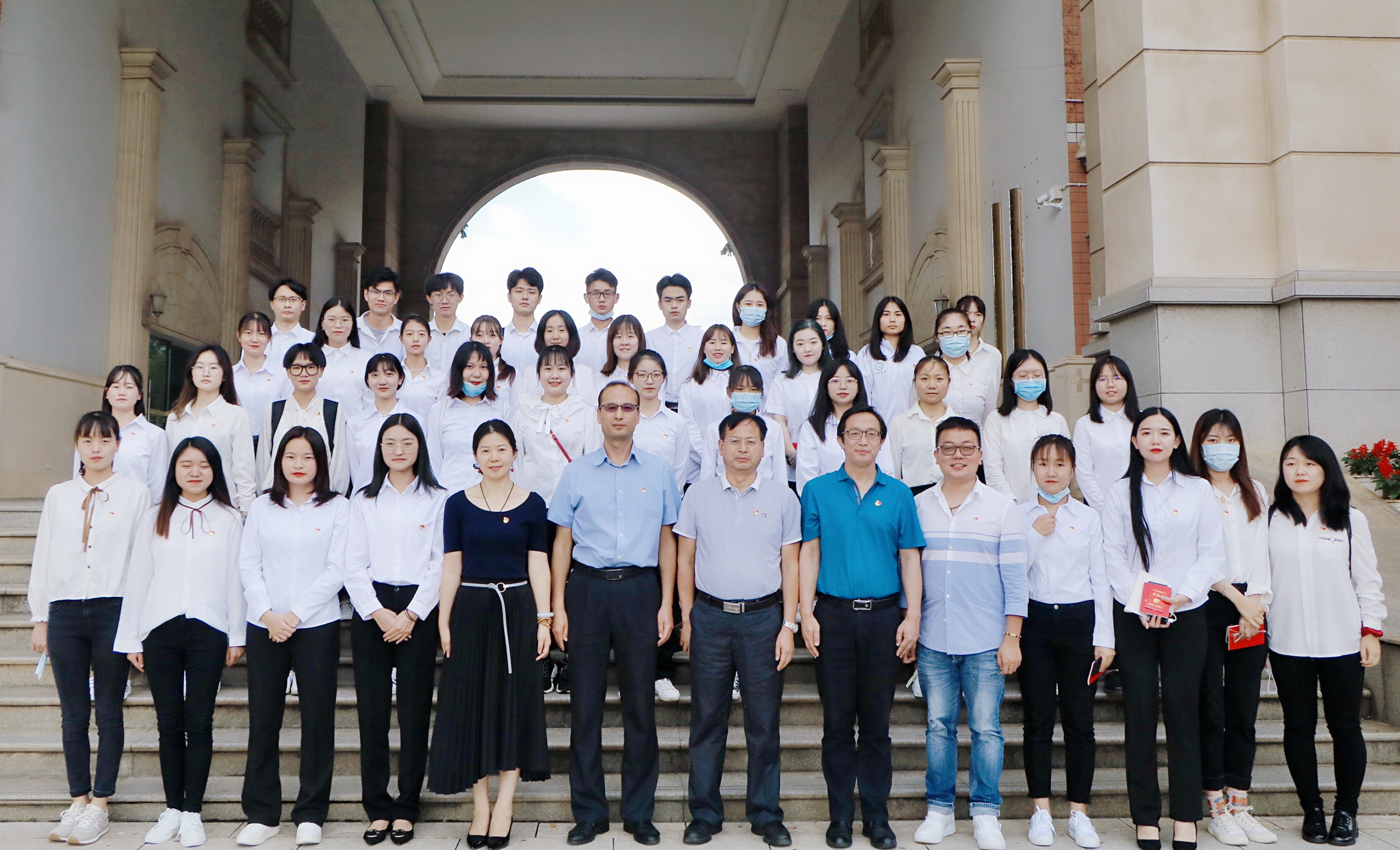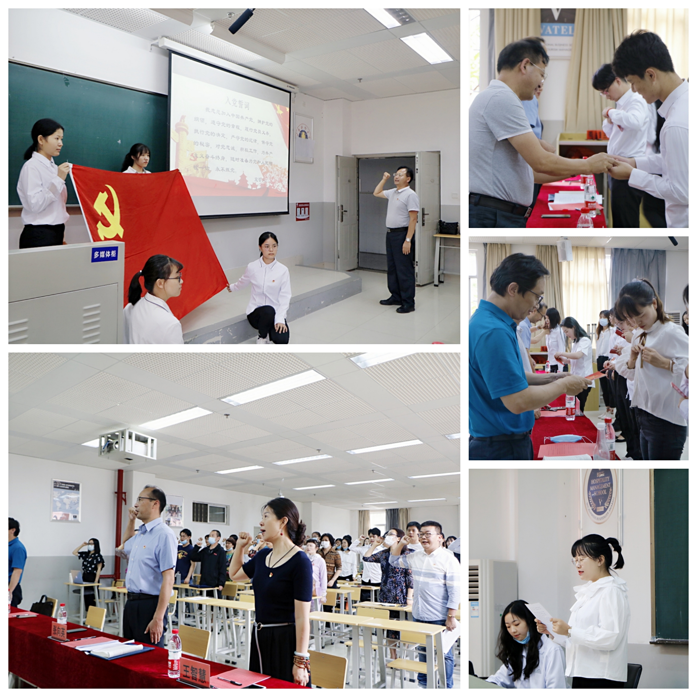 活动在《国际歌》歌声中拉开序幕,学院党委委员为2020年上半年新发展预备党员代表佩戴党徽并发放党章和《党费证》。随后,在王小永老师的带领下,2020年新发展预备党员和其余党员一起面对鲜红的党旗,庄严地举起右手,向党旗宣誓,表达了为共产主义事业奋斗终生的决心。