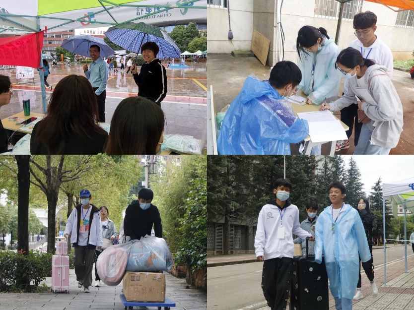 在龙泉路237号北院西门门口、在丹华宿舍1栋和4栋间、在卓远楼的走道上,在博雅广场的每一个角落,都有我们志愿者的足迹和笑脸。用青春去迎接新的青春,用故事去诉说新的故事,在大雨中披上雨衣,志愿者们健步奔走在报到程序的每一个区域,从接过新生的行囊,到目送他们回宿舍,青春就是用爱心和耐心去践行我们温暖的怀抱,旅酒大家庭以家之名欢迎每一位“小云彩”的到来!