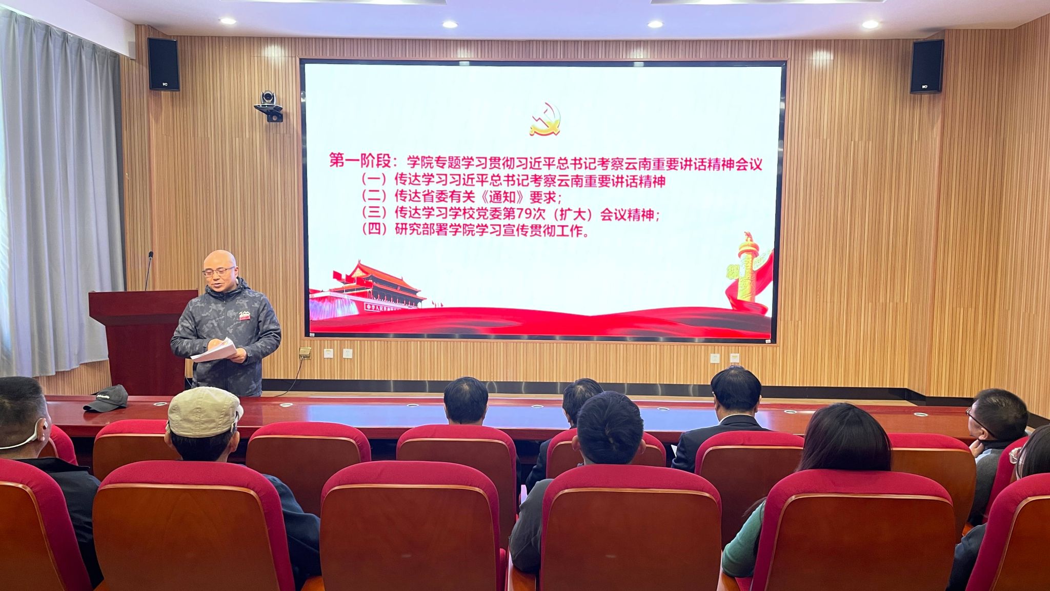 会议第一阶段,李健传达学习习近平总书记考察云南重要讲话精神、省委有关《通知》要求和学校党委第79次扩大会议精神,安排了学院相关学习宣传贯彻工作。会议第二阶段,李健就学院深入贯彻中央八项规定精神学习教育进行动员。他指出,学院党委将严格按照学校党委的工作部署和要求,开展深入贯彻中央八项规定精神学习教育,这是巩固深化主题教育和党纪学习教育成果、纵深推进学院全面从严治党的有力抓手,是锲而不舍推动工作作风持续向好、推动党的决策部署落实落地、进一步密切师生关系的重要任务。学院全体党员干部务必切实提高政治站位,做到思想和行动高度统一,把开展学习教育作为当前一项重要政治任务来完成。
