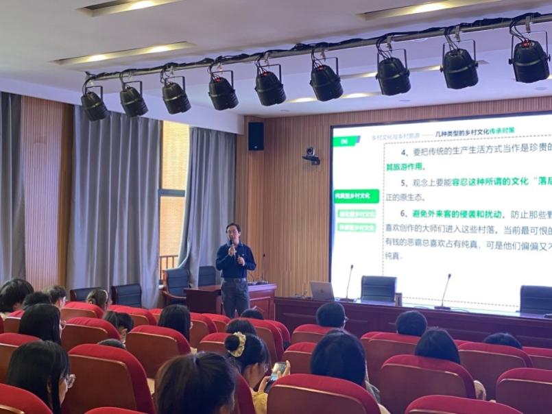 谢教授主要介绍了乡村振兴的意义、乡村振兴的社会发展背景、乡村文化传承存在的问题和困难、乡村旅游新产品新业态等内容。讲座结合昆明干部回乡规划、乡村特色养殖、乡村文化创意等实例,分析了“纯真型、蜕变型、异质型”三种乡村文化嬗变的类型,提出了传承乡村文化应实施圈出传统生产生活方式保留地、强化物质遗存的保护、将非物质文化遗产的代表性项目纳入保护的重点项目、允许“落后”的生产生活方式存在,尊重多样性、避免外来资本客的过度旅游开发、以及政策扶持等有利于乡村振兴、乡村文化与乡村旅游联动的对策措施。