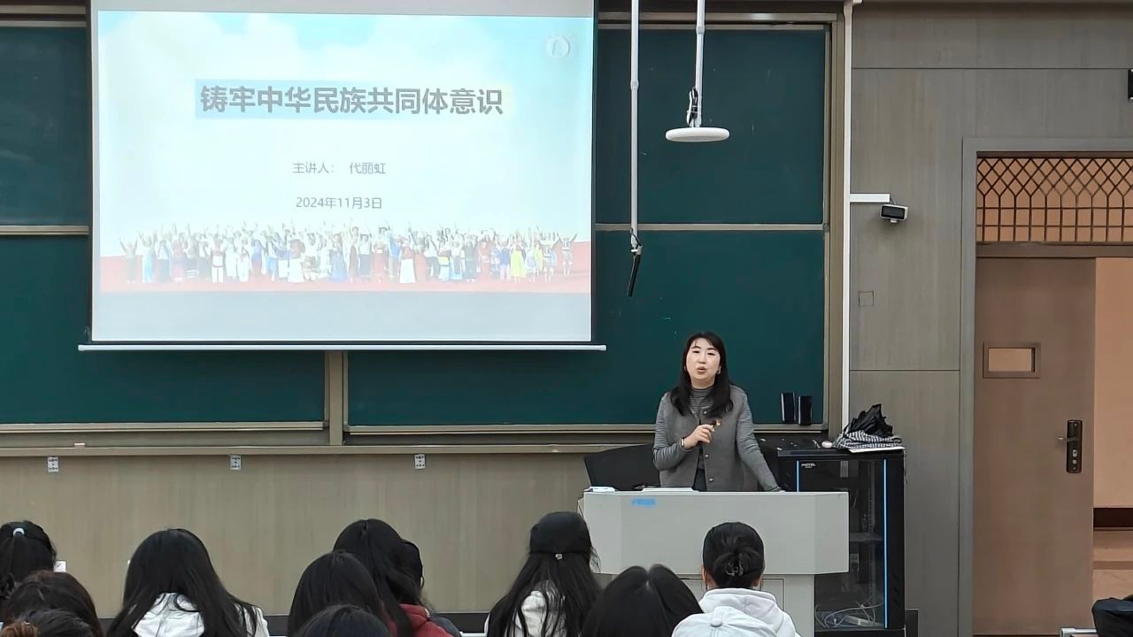代丽虹以“筑牢民族梦,共绘同心圆”主题,围绕着中华民族共同体意识的提出与发展、习近平总书记的相关重要论述、铸牢中华民族共同体意识的基本内涵、高校如何做、新时代青年如何做五个方面,阐述了高校铸牢中华民族共同体意识教育的重要性和必要性。她强调,引领青年大学生深入理解党的民族工作主线和铸牢中华民族共同体意识是高校的责任与使命,要将铸牢中华民族共同体意识与建设教育强国更好地结合起来,为实现中华民族伟大复兴提供更多有力支撑。随后,第十八期青马班结业仪式在庄严的国歌声中拉开帷幕。代丽虹对青马班开展情况进行总结,宣读了李泽燕等27名优秀学员的名单。唐榕作为优秀学员代表上台发言,分享了自己的学习心得和感悟,她表示通过青马班的学习增强了自己的政治理论素养和实践能力,将继续保持学习的热情和进取的精神。