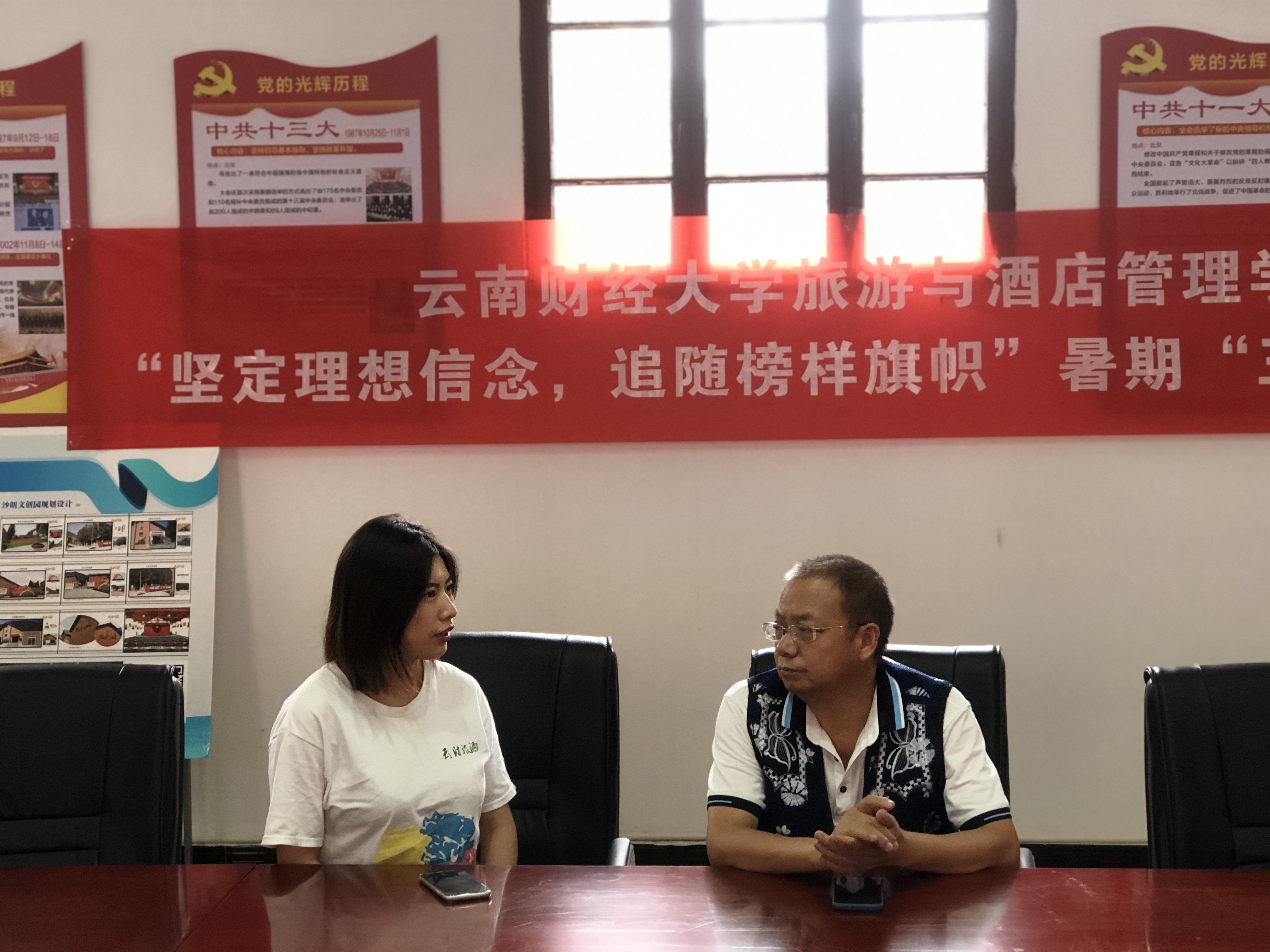 在文创园的党建会议室,实践队员们采访了五华区非物质文化(白族文化)传承人张国启老师。张老师是民间文学和地方文史研究爱好者,业余时间长期研究沙朗白族文化和西翥地方文史,怀着对白族文化的热爱,坚守着沙朗白族文化的开发与传承。谈到继承和发扬白族文化的原因,张国启老师回忆起以前的白族人群居,就像世外桃源,“稻花香里说丰年,听取蛙声一片”,怀揣着美好憧憬和期待,坚持着做传承和发扬白族文化这件事。张启国老师给我们介绍他撰写的书籍《沙朗白族风情录》、《灵仪西翥》等,记录了有关沙朗白族的文化历史,笔耕不辍,撰书写志。