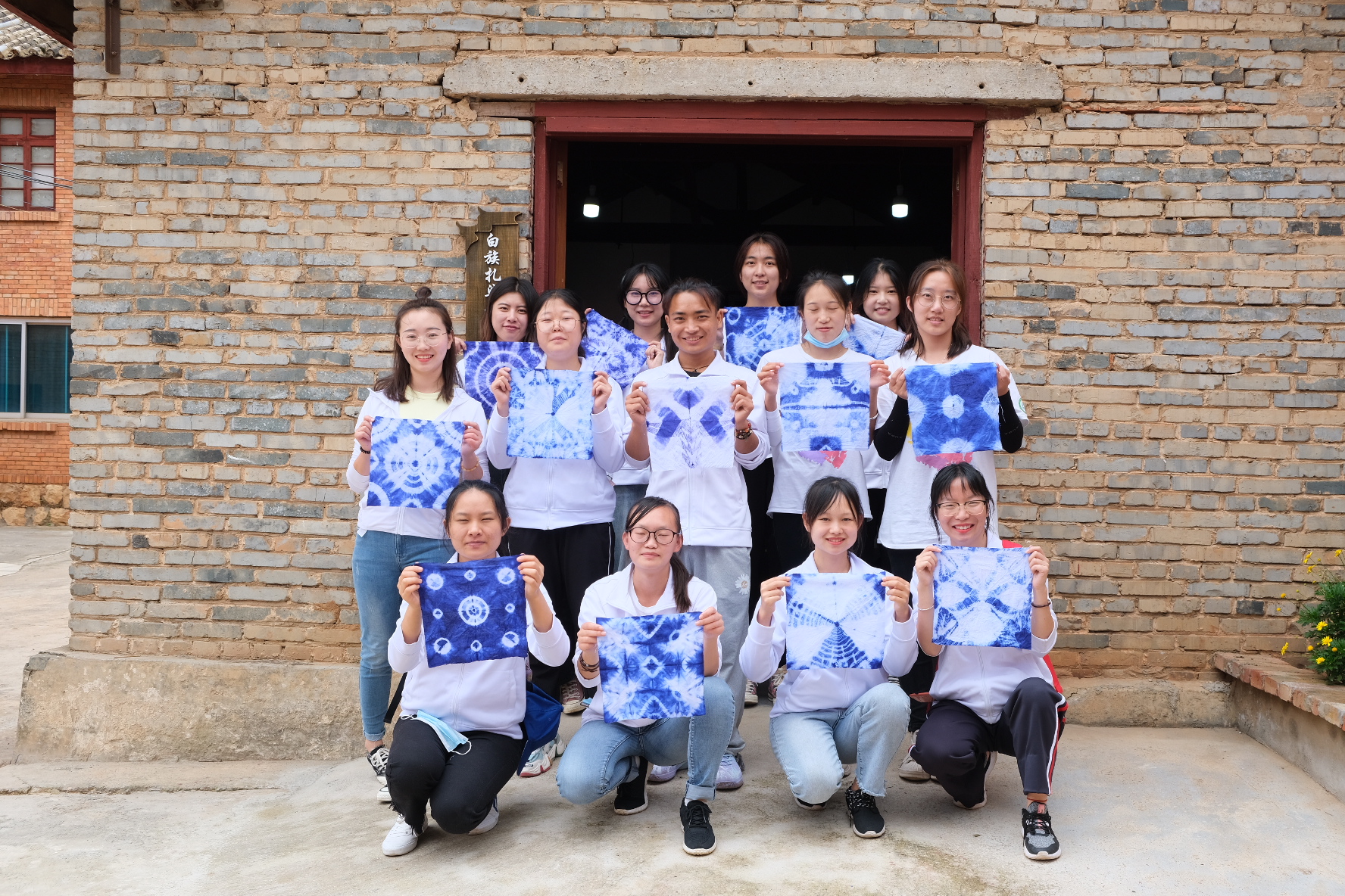 在文创园里,实践队员们亲自动手实践了白族传统染色工艺——扎染,在讲解员老师的指导下,感受到了白族扎染艺术的有趣和不易。队员们大胆创作,扎出各种形状,在染出之前,没有人知道它会是什么模样,就像我们青年大学生们,拥有着无限的可能。