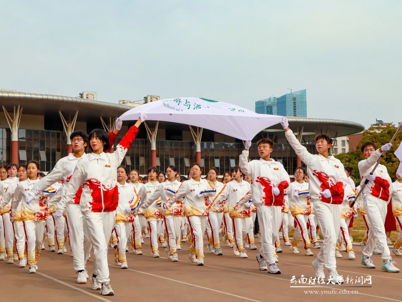 2023年11月29日,bat365在线中国官网登录入口举办了第三十九届运动会。开幕式于下午两点开始,标兵就位后,国旗护卫队迈着雄赳赳气昂昂的步伐向着主席台踏步而来,鲜花队和彩旗队率先入场。旅游与酒店管理学院学生方阵第四个入场,四名同学高举学院院旗,旁边两名同学奋力挥舞着bat365在线中国官网登录入口校旗,带领整个方阵队伍昂首前进。整齐划一的队形和步伐展示了旅游与酒店管理学院“明德、敏学、笃行、致远”的精神,经过主席台时高昂洪亮的口号充分展现了属于旅酒学子的朝气与活力。