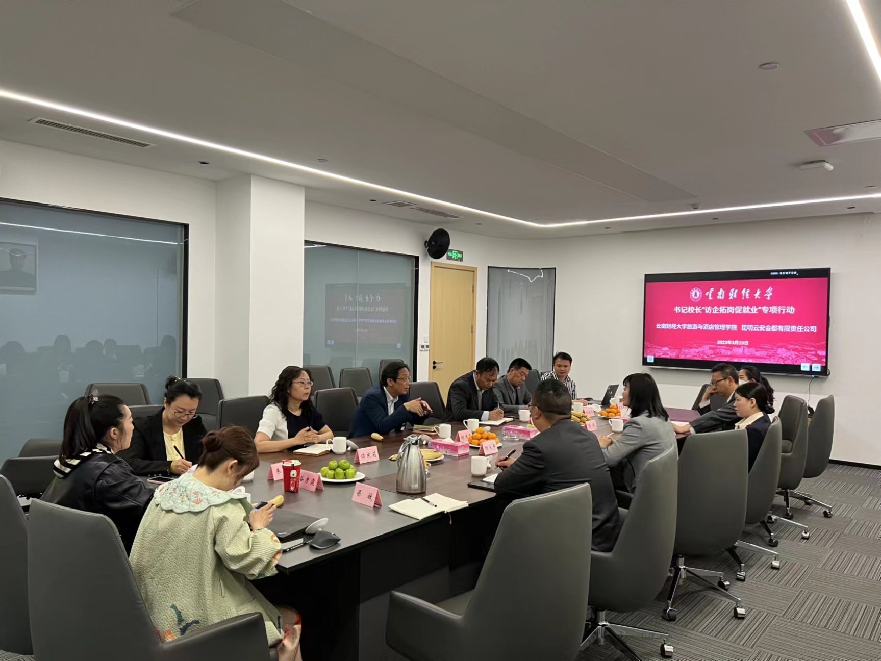 3月23日下午,旅游与酒店管理学院党委副书记李永祥、副院长谢洪忠带队,实践实训科主任赵顺顶、学研中心主任班先海、会展经济与管理系系主任谭庆莉、会奖旅游基地联系人朱韬、辅导员谷彦霆、教师代表梁媛一行到昆明云安会都有限责任公司访企拓岗。会都总经理张杜娟、会务部总监杨永平、人力资源部总监陈群、财务部经理张彤武、财务部主管唐仕蓉、人力资源部主管储惠出席了会议。