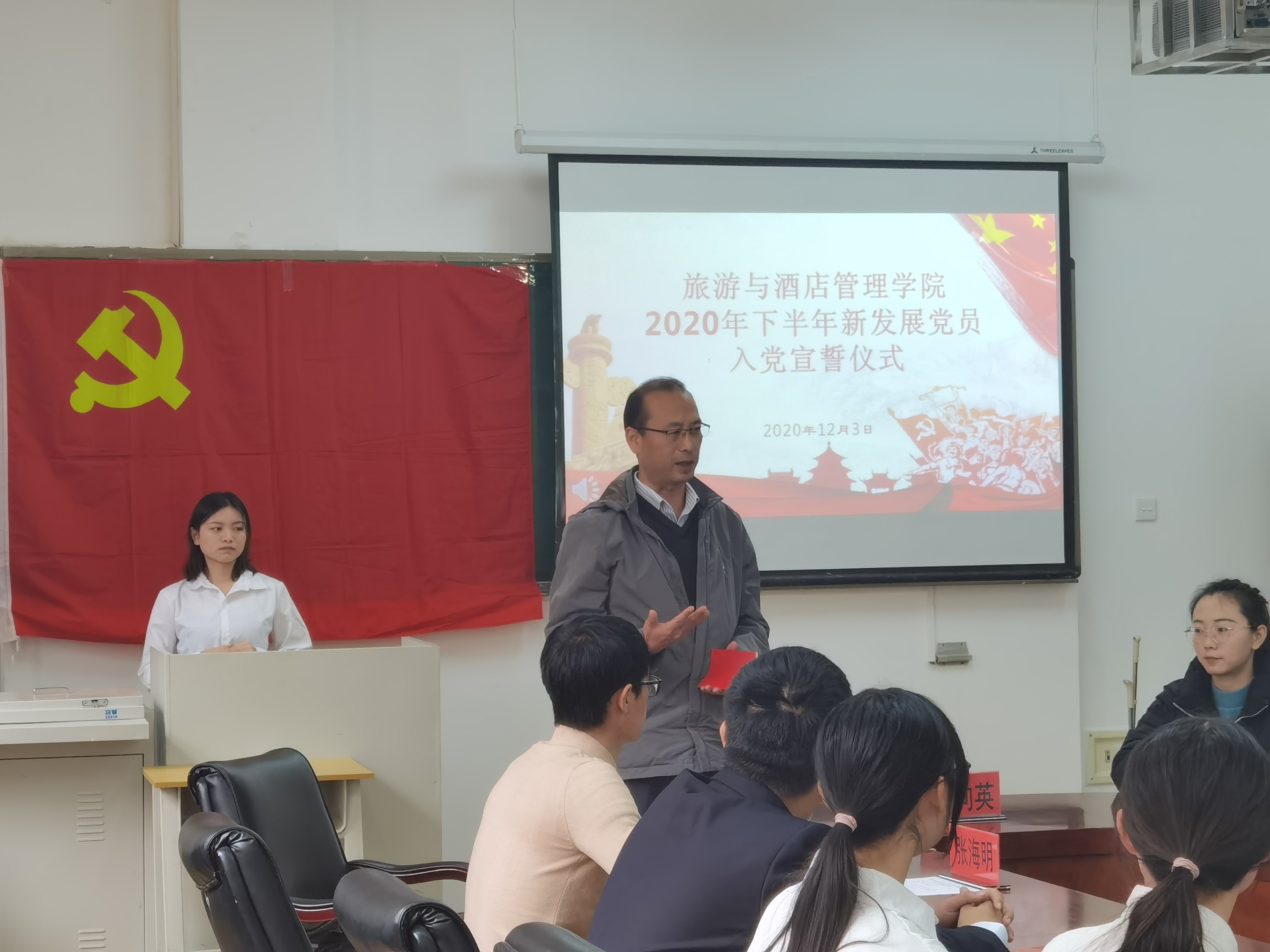 12月4日13:00,旅游与酒店管理学院在卓远楼213会议室举行2020下半年预备党员入党宣誓仪式。学院党委书记张向英、专职组织员杨倩、学生支部书记杨雅淑、张海明,及30名2020下半年新发展的预备党员参加活动。