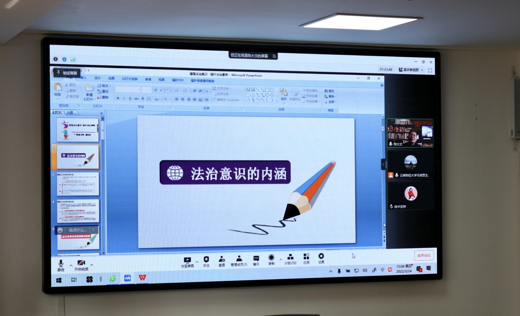 3月24日下午,2022年云南省高校“思想道德与法治”课集体备课会在bat365官网举行。国家教学名师、同济大学长聘教授、马克思主义学院博士生导师、教育部“思想道德与法治”分教学指导委员会副主任委员陈大文教授,受邀以线上形式为全省高校思政课教师作《增强法治意识 提升法治素养》专题辅导。马克思主义学院常务副院长宁乐锋教授主持。