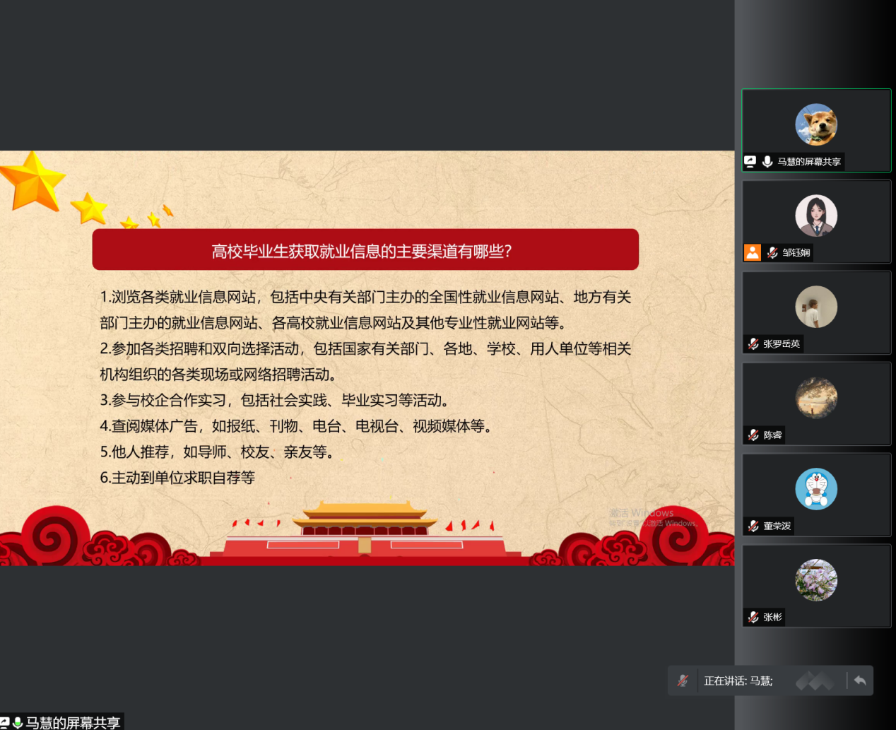 会上,徐朵、张静雯、代庭冲三位同志从考录选调生、考取公务员、事业单位招聘、就职国企央企等四个角度,围绕马克思主义专业对口的就业机会类型、获取就业信息的渠道、获取就业复习资料的途径、就业应具有的技能或修养、面试时的技巧、有效协调毕业论文写作和找工作的冲突、考博的复习和准备等几个方面,为我们分享了求职就业的心得体会和宝贵经验。此外,为帮助大家更好的了解云南省的就业政策,马慧同志还带头学习了《云南省促进高校毕业生就业创业政策100问》,整体学习效果良好。