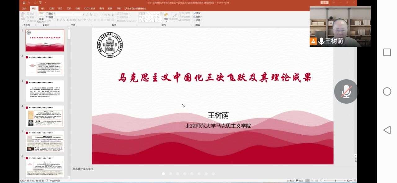 7月1日,王树荫教授作题为“马克思主义中国化三次飞跃及其理论成果”的专题讲座。王教授以深入学习领会党的十九届六中全会精神为切入点,围绕马克思主义中国化的意蕴与逻辑、历程与成果、成就与经验三个方面展开论述,分享了自己的思考和研究成果,