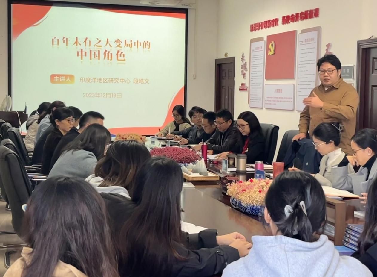 科研院所(中心)党委教工第三党支部(印度洋研究中心)教师党员段皓文以《百年未有之大变局中的中国角色》为主题给全体党员讲授微党课。段皓文以时代之变中的“三变三新”为切入点,重点阐述了百年未有之大变局的深刻内涵、主要特征,以及当下我国发展所面临的挑战和机遇,在全球发展中贡献的中国智慧和中国力量。他提出,学生党员要坚持党的领导,保持党员先进性,以更高的目标、更严的党性原则要求自己,以百年未有之大变局为契机,将自我成长融入国家发展、融入时代发展。