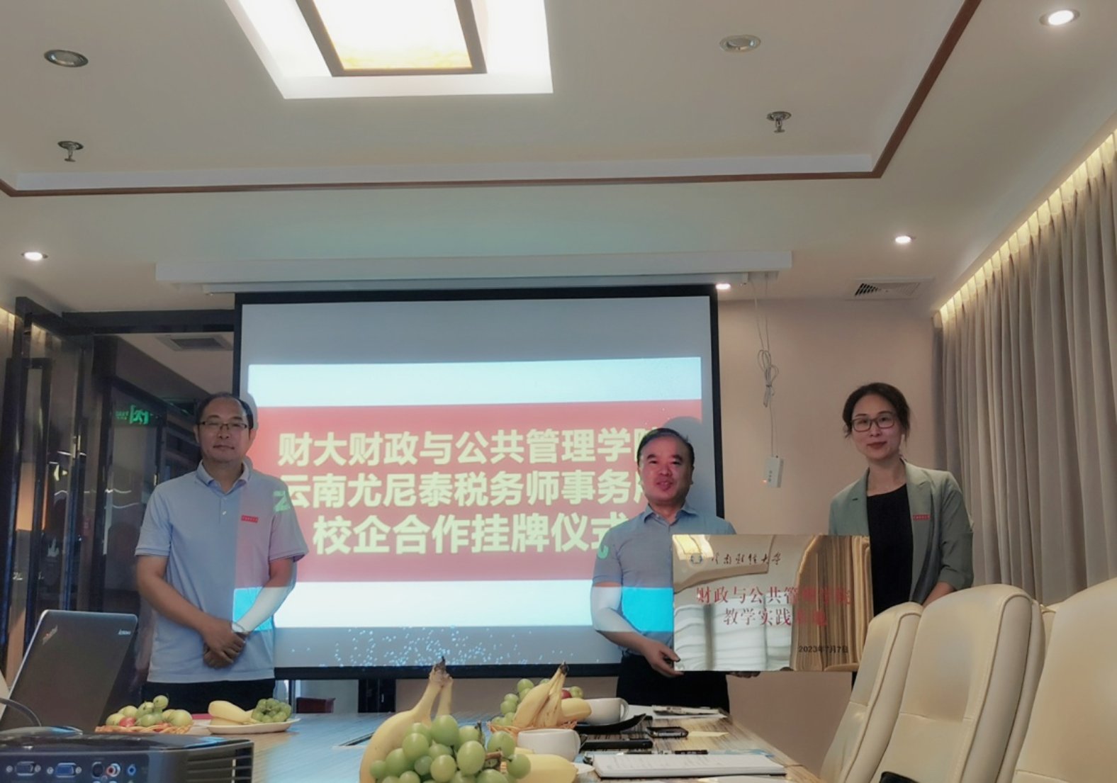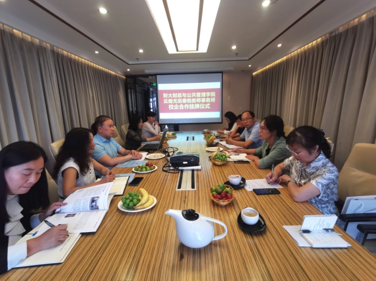 7月7日,财政与公共管理学院党委副书记王晓芬、副院长和立道一行到云南尤尼泰税务师事务所有限公司(以下简称“尤尼泰税务师事务所”)开展访企拓岗座谈暨实践教学基地挂牌仪式。