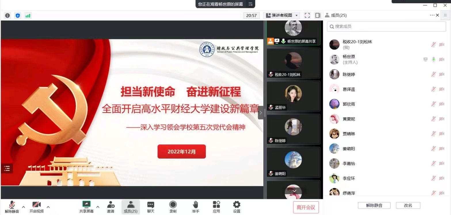 为深入学习领会学校第五次党代会精神,近期,财政与公共管理学院通过专题党课、全院教职工理论学习、自学、各师生党支部“主题党日”等方式认真开展学校第五次党代会精神学习宣传。