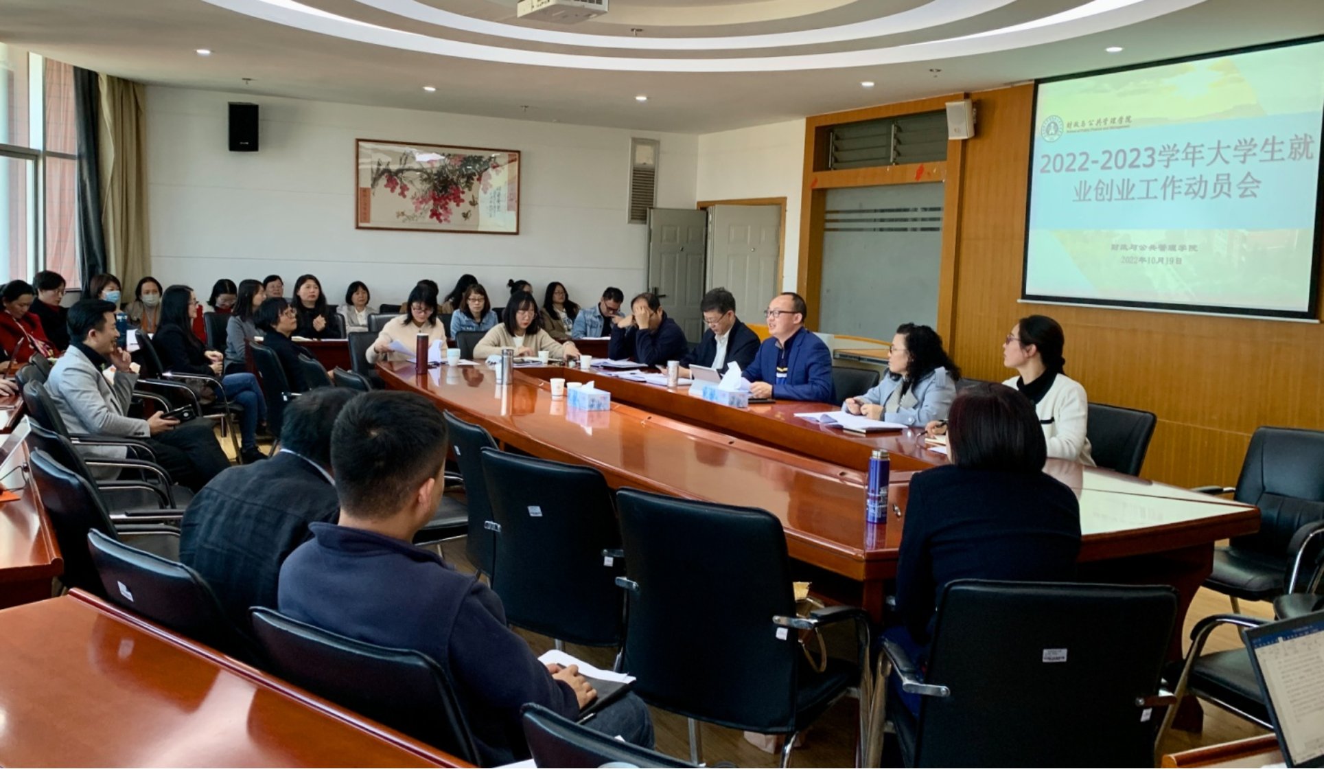 10月19日下午,财政与公共管理学院在逸夫楼923会议室召开2022-2023学年大学生就业创业工作动员会。学院党委书记荣小红,院长缪小林,党委副书记王晓芬,副院长韩全芳、和立道,各教学系主任,全体辅导员,毕业班班主任,研究生导师及专业课教师参加了会议。会议由王晓芬主持。