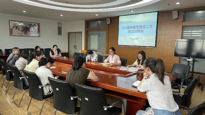 7月7日下午,财政与公共管理学院在逸夫楼923会议室召开2023届毕业生就业工作启动动员会,学院党委副书记王晓芬、学生管理科科长饶篁、全体辅导员及2023届班主任参加,会议由王晓芬主持。