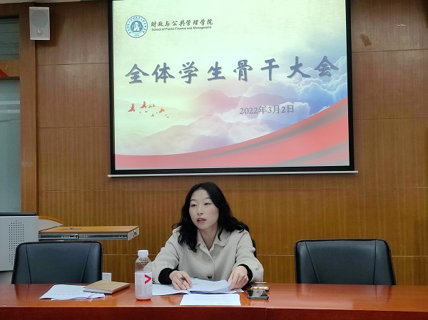 3月2日晚七点,财政与公共管理学院于南院逸夫楼923会议室,召开2022年春季学期第一次全体学生骨干大会。学院团委、青协、学生会、研会等学生组织骨干参与本次大会,会议由学院辅导员王淑一老师主持。