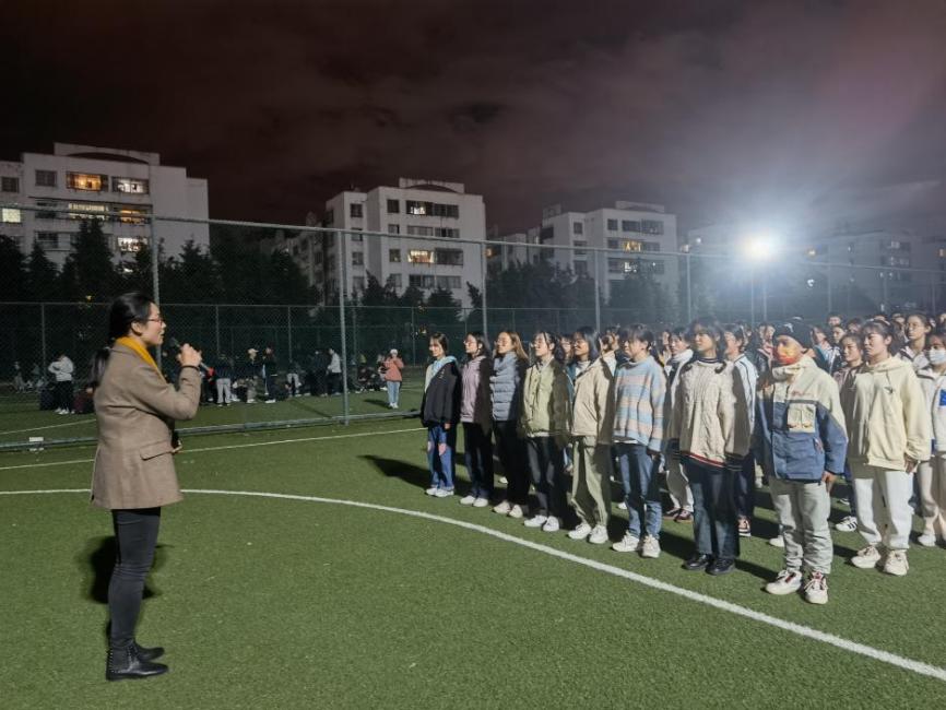 11月19日晚上8点,财政与公共管理学院党委副书记王晓芬与团委书记饶篁、辅导员王淑一老师来到训练场,为辛苦训练的同学们加油鼓劲。