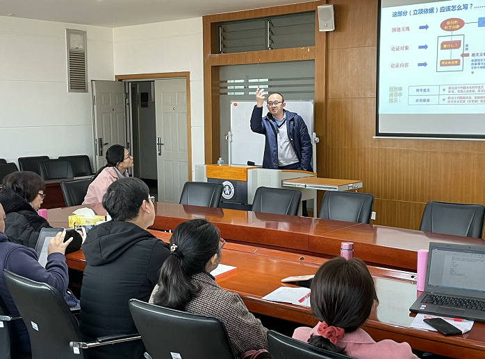 讲座后半部分,缪教授以自己主持和参与的国家自然科学基金和国家社科基金两个项目的申请书为例佐证了前面所讲的精辟总结。通过申请书的分享让在场的老师们感受到了学术研究的精妙思路和具体的写作技巧,大家不断报以热烈的掌声。