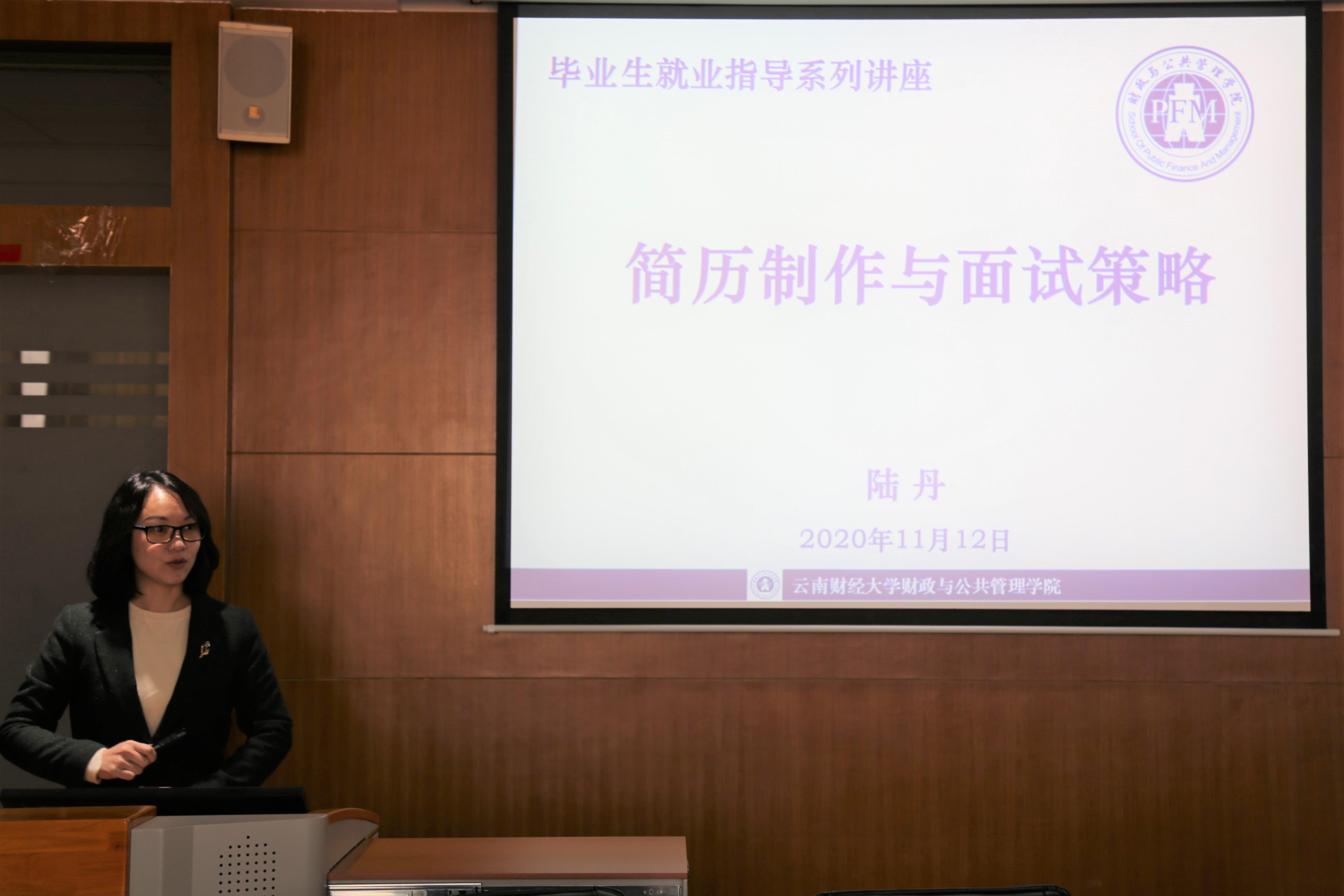 11月12日下午,bat365官网财政与公共管理学院举办2021届毕业生简历制作和面试指导讲座,讲座采用线上线下相结合的方式开展。学院教师陆丹主讲,学生管理科老师方素祥主持讲座,学生管理科辅导员王淑一及全体2021届毕业生参加讲座。