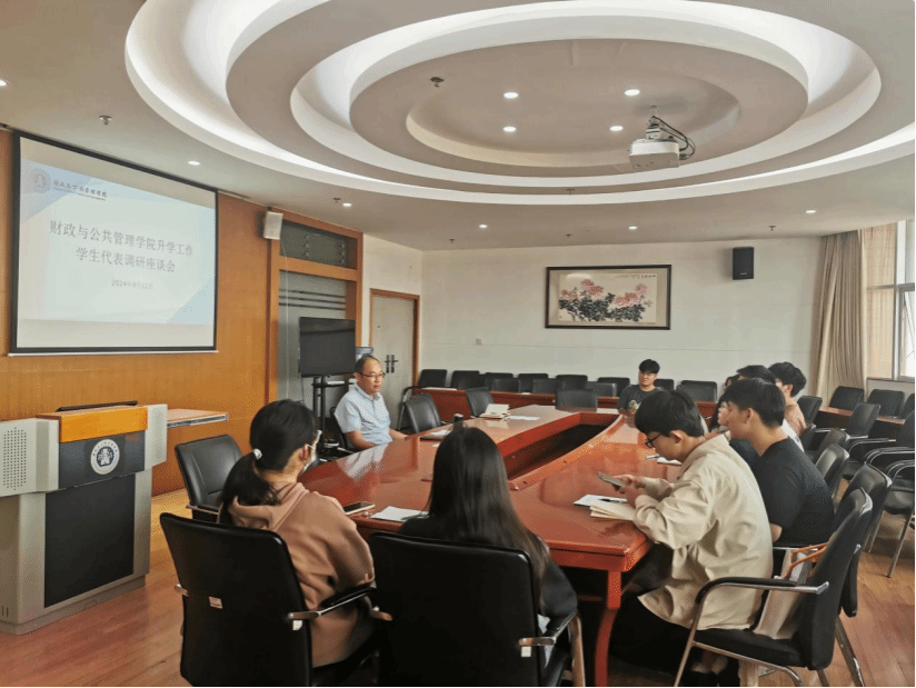 9月11日,财政与公共管理学院在南院逸夫楼923会议室召开升学工作学生代表座谈会。学院副院长和立道,学生管理科辅导员毛丹及大二、大三年级学生代表参加座谈。