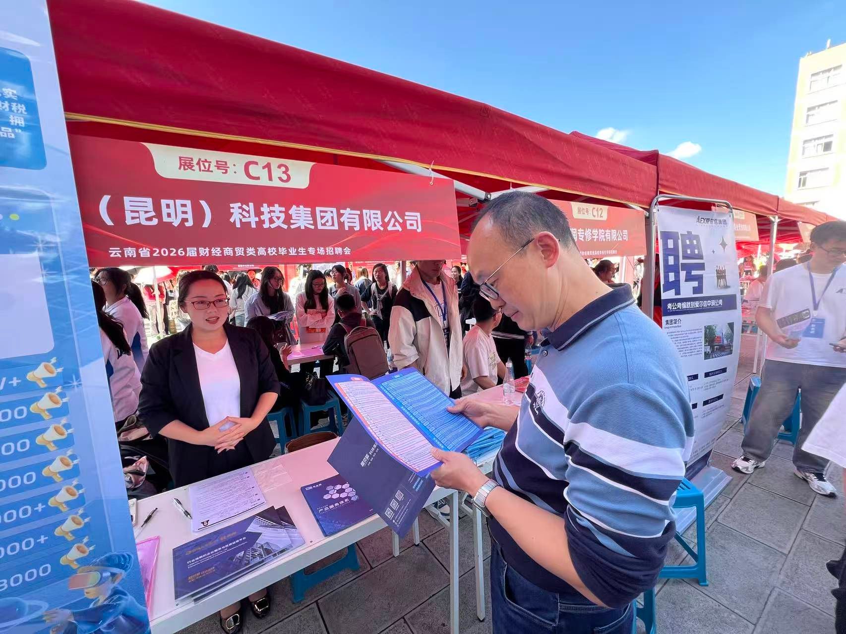 9月28日,由中共云南省委教育工委、省教育厅、云南省工商业联合会(总商会)联合主办,云南省大中专毕业生就业服务中心、bat365在线中国官网登录入口共同承办的云南省2026届财经商贸类高校毕业生专场招聘会在bat365官网龙泉路校区新阳广场隆重举行。财政与公共管理学院积极响应、精心组织,联系13家企业参与此次招聘会,学院党政领导班子高度重视,同步举办学院“访企拓岗”座谈会,为毕业生就业和校企合作搭建高质量平台。