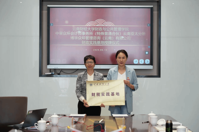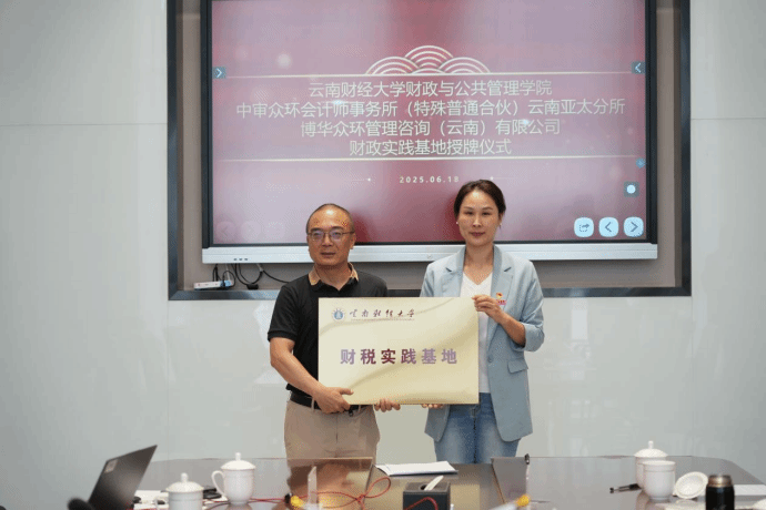2025年6月18日上午,财政与公共管理学院党委书记王晓芬带队,赴中审众环会计师事务所(特殊普通合伙)云南亚太分所、博华众环管理咨询(云南)有限公司开展访企拓岗调研,举行财税实践基地签约挂牌仪式。与中审众环会计师事务所(特殊普通合伙)云南亚太分所联合党总支部共同开展党建共建活动。活动由亚太经济服务(云南)集团有限公司董事、博华众环管理咨询(云南)有限公司总经理肖勇主持。