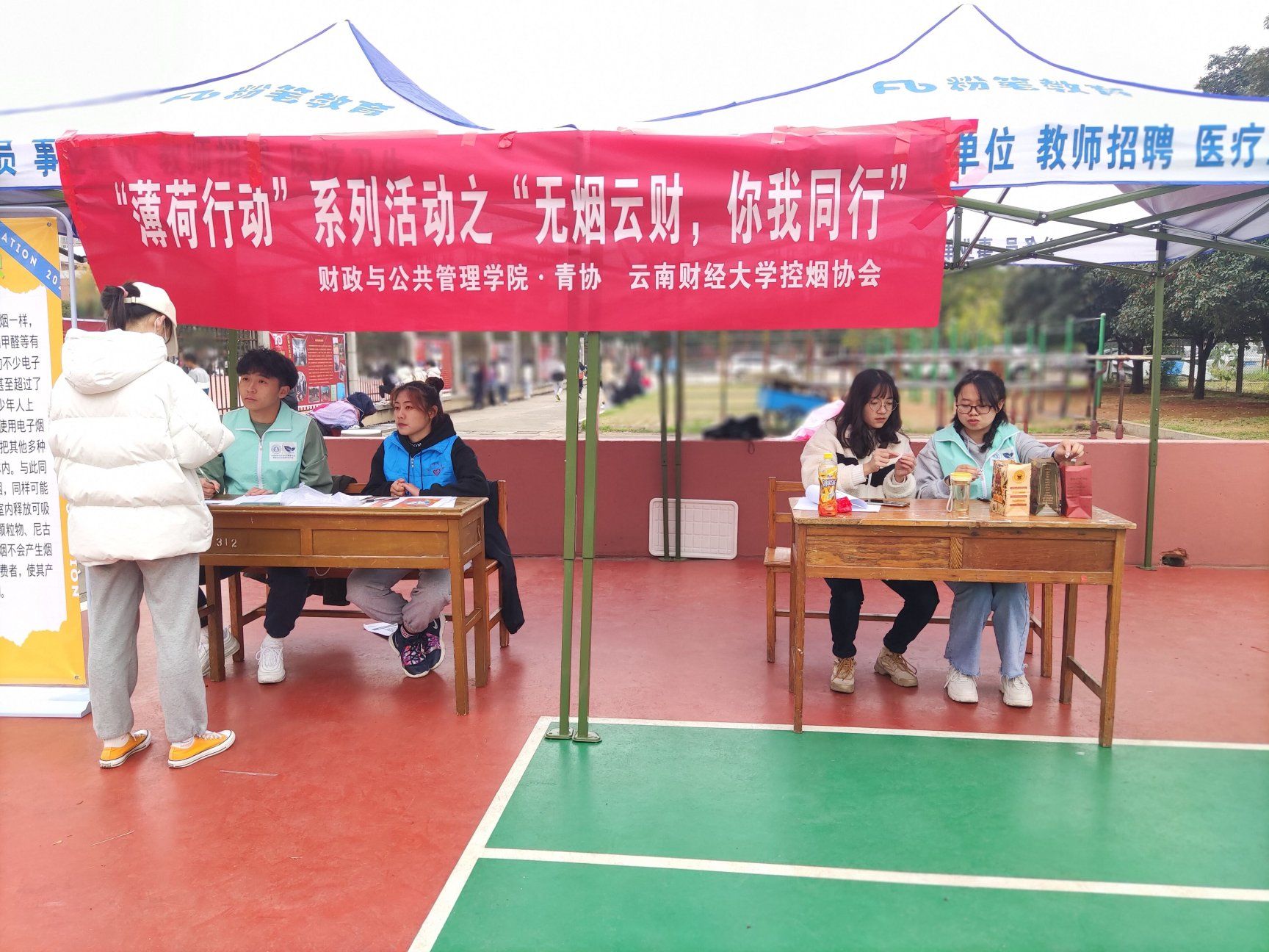 11月24至26日,为了提高同学们对传统卷烟、电子烟危害的认识并为打造“无烟校园”助力,财政与公共管理学院青年志愿者协会与bat365在线中国官网登录入口控烟协会合作,在bat365在线中国官网登录入口致远球场共同举办“薄荷行动”系列活动之“无烟云财·你我同行”禁烟宣传活动。