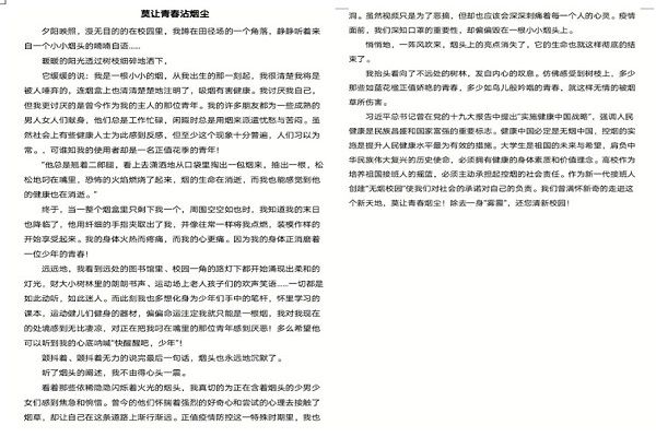 活动期间,同学们围绕无烟环境建设、烟草流行监测、警示烟草危害、戒烟服务、吸烟与相关疾病、青少年控烟、烟税与价格、禁止烟草广告、促销和赞助、电子烟等方面内容并结合自己对烟草的认识及烟草的危害和自己在生活中吸烟或者被动吸烟的经历撰写文章,并积极投稿。社团结合作品立意、文笔等标准对作品进行了评审,并将评选结果通过活动群公布。通过此次征文活动的举办,同学们从真正意义上了解吸烟对自己和他人以及环境的危害巨大。同时也鼓励同学们大家在思想上和行动上支持控烟活动,加大了校园控烟宣传力度。