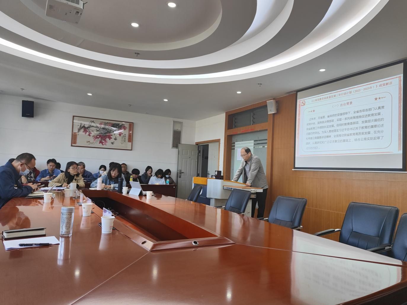 和立道围绕政策出台背景、主要内容、主要特点三个方面解读了《云南省教育高质量发展三年行动计划(2023—2025年)》,并就该政策的指导思想、行动目标、重点任务、保障措施进行了详细阐述。和立道传达了全省教育发展大会会议精神,他表示,全院教职工要创新教育教学方式,实施有效教学,为培养优质学生打造高效课堂,助推学校持续稳步高质量发展。